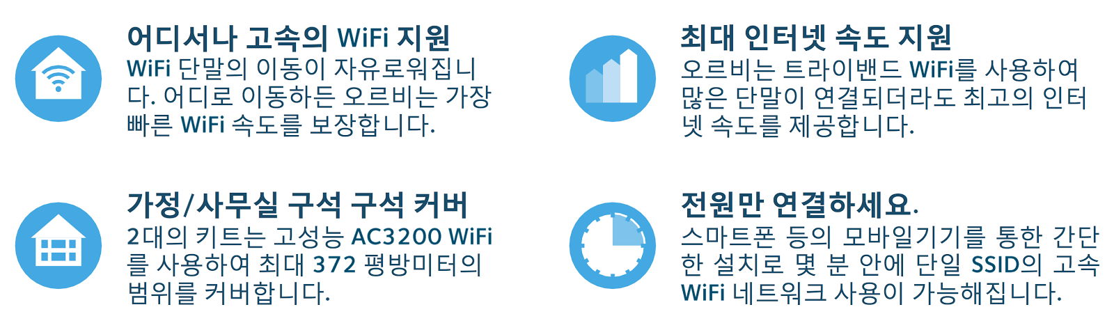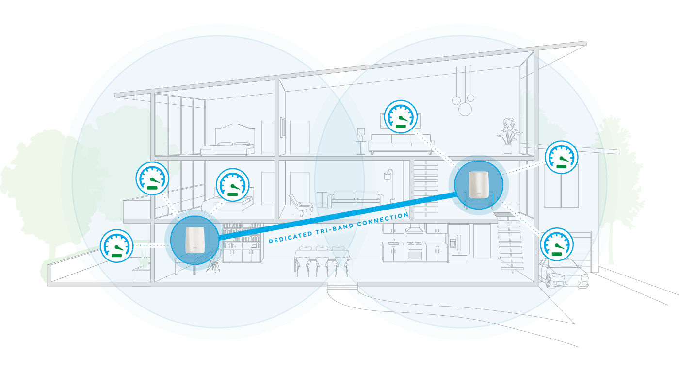 AC3000으로 불리는 오르비는 트라이 밴드 구성으로 최대 400Mbps, 혹은 1733Mbps 및 867Mbps의 3가지 신호와 속도를 제공할 뿐 아니라 단 하나의 ‘와이파이 신호’로 연동되기 때문에 거리에 따라서 메인 오르비와 오르비 세틀라이트를 매번 다시 연결하고 끊을 필요가 없습니다.