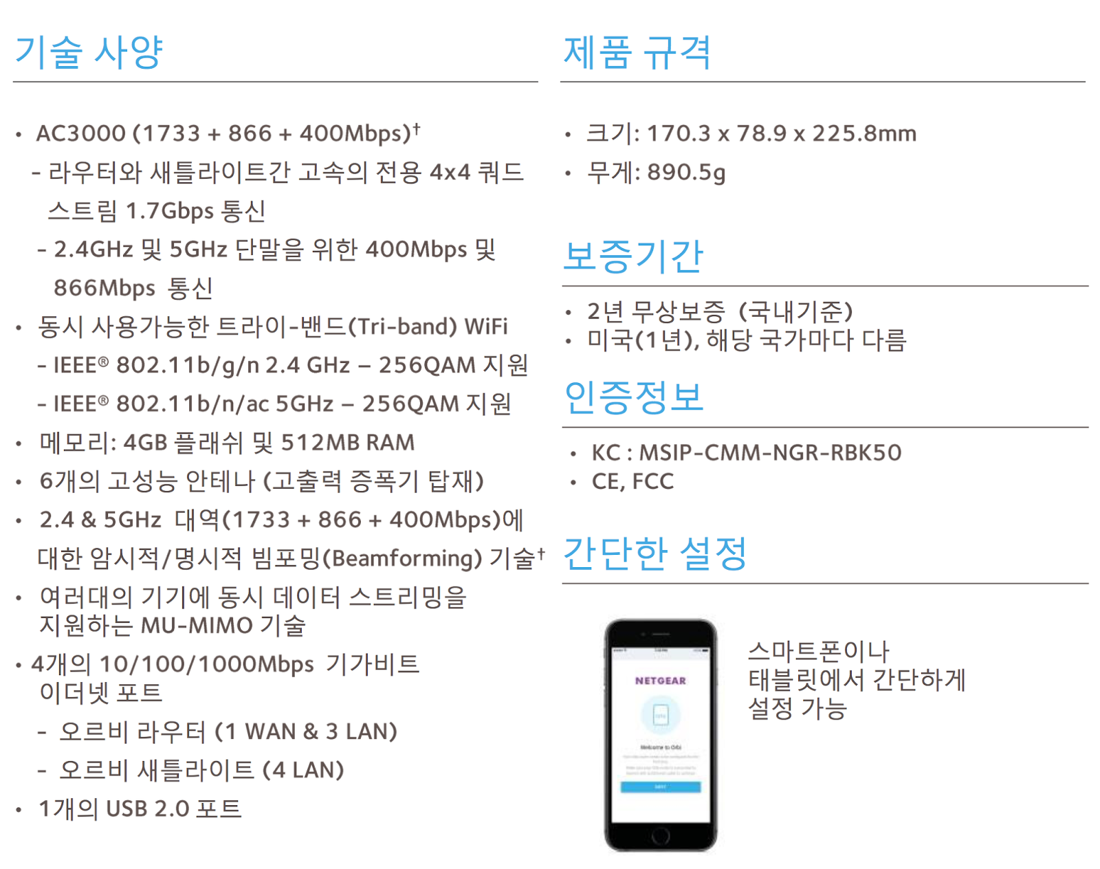 4기가의 플래시와 512MB에 이르는 대용량 램, 6개의 고성능 내장 안테나를 비롯한 고출력 확장기, 이외에도 빔포밍 기술과 같은 넷기어의 고유 인터넷 기술을 그대로 품은 오르비는 세계 최초의 트라이밴드 Mesh 와이파이 시스템으로서, 무선 인터넷에 대한 기준을 새롭게 재정의하는 제품이 아닐까 싶었습니다. - MACGUYVER.