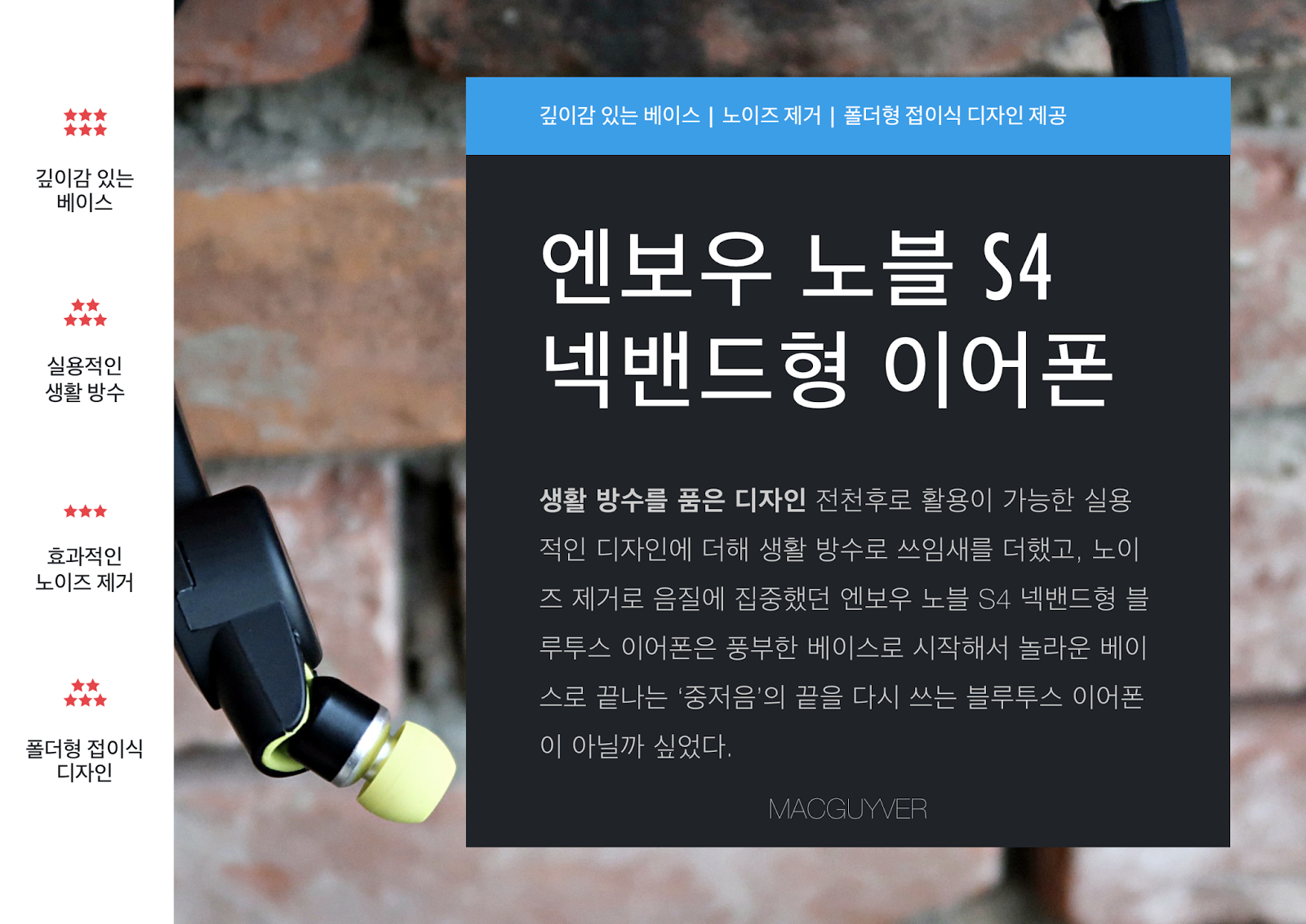 가성비 블루투스 이어폰이라 부를 수 있었던 엔보우 노블 S4 블루투스 이어폰은 분명 가볍게 한번 구입해서 오랫동안 사용할 수 있는 핫템이 되어줄 것 같았습니다. - MACGUYVER.