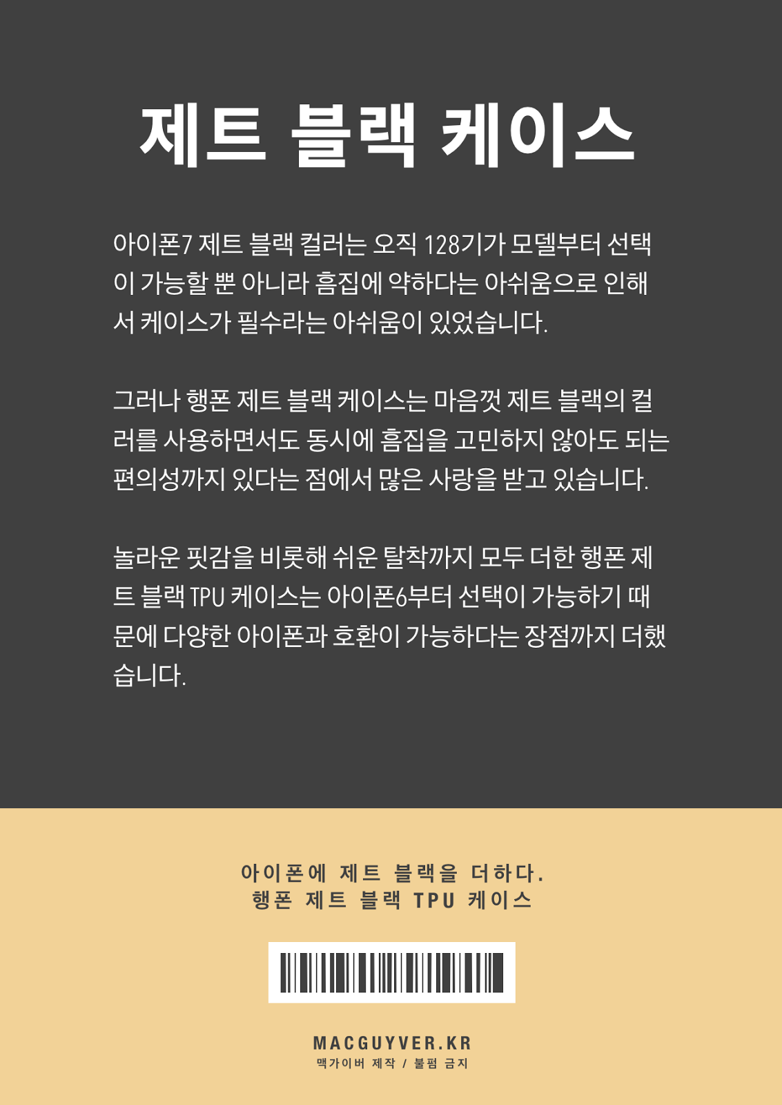 이처럼 깊이감 있는 고광택 블랙에서부터 뛰어난 안전성까지 만족스러웠던 행폰 제트 블랙 TPU 케이스는 제트 블랙을 탐하는 소비자들에게 좋은 선택지가 되어줄 것으로 보입니다. - MACGUYVER.