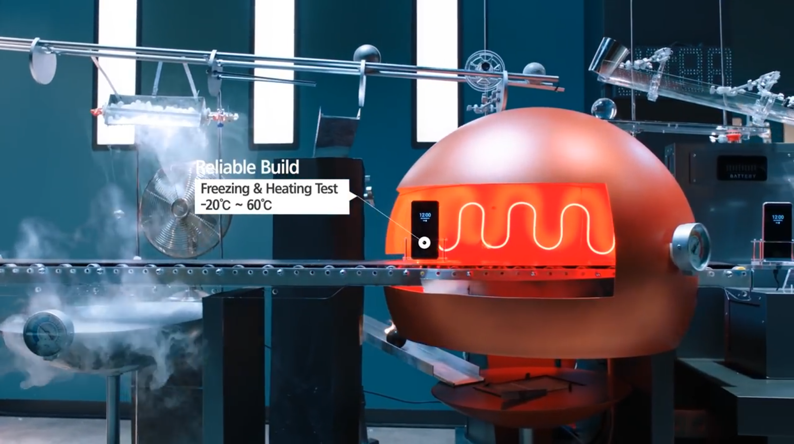 G6가 얼마나 튼튼한 폰인지를 단순히 수치상으로만 보여주는 것이 아닌, 날것이라 부를 수 있는 실험실의 장면을 보여주면서 실제 ‘튼튼함 = G6’라는 연결고리를 만든 것인데, 전개 방식도 훌륭했고 매우 무겁고 튼튼해 보이는 구슬을 비롯해 날이 선 듯한 실험실의 사운드가 더해지며 전체적으로 엘지가 전달하려는 장점이 제대로 전달되는 것처럼 보였다.