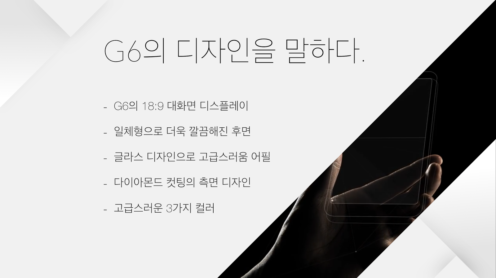 이를테면, 검은 배경이나 하얀 배경을 두고서 G6의 디자인을 하나씩 그려나가는 모습, 후면의 엣지 있는 디자인이 고급스럽게 채워지는 모습, 빛에 따라서 반짝이고 손에 폭 잡히는 모습까지 연이어서 소개하며 미래 지향적인 제품임을 제대로 어필한 것이다.