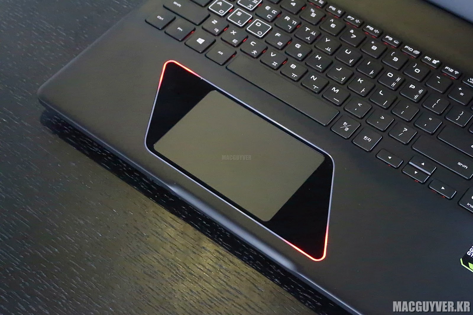 특히나 내부 키보드를 비롯해 터치패드 주면으로 자리를 잡은 붉은색의 컬러는 그 자체로 차별화가 되는 포인트라 부를 수 있었습니다. 밤이 되면 더욱 큰 존재감을 발휘하면서 게이밍 노트북 특유의 고급스럽고 강렬한 이미지를 전달해줬기 때문입니다.