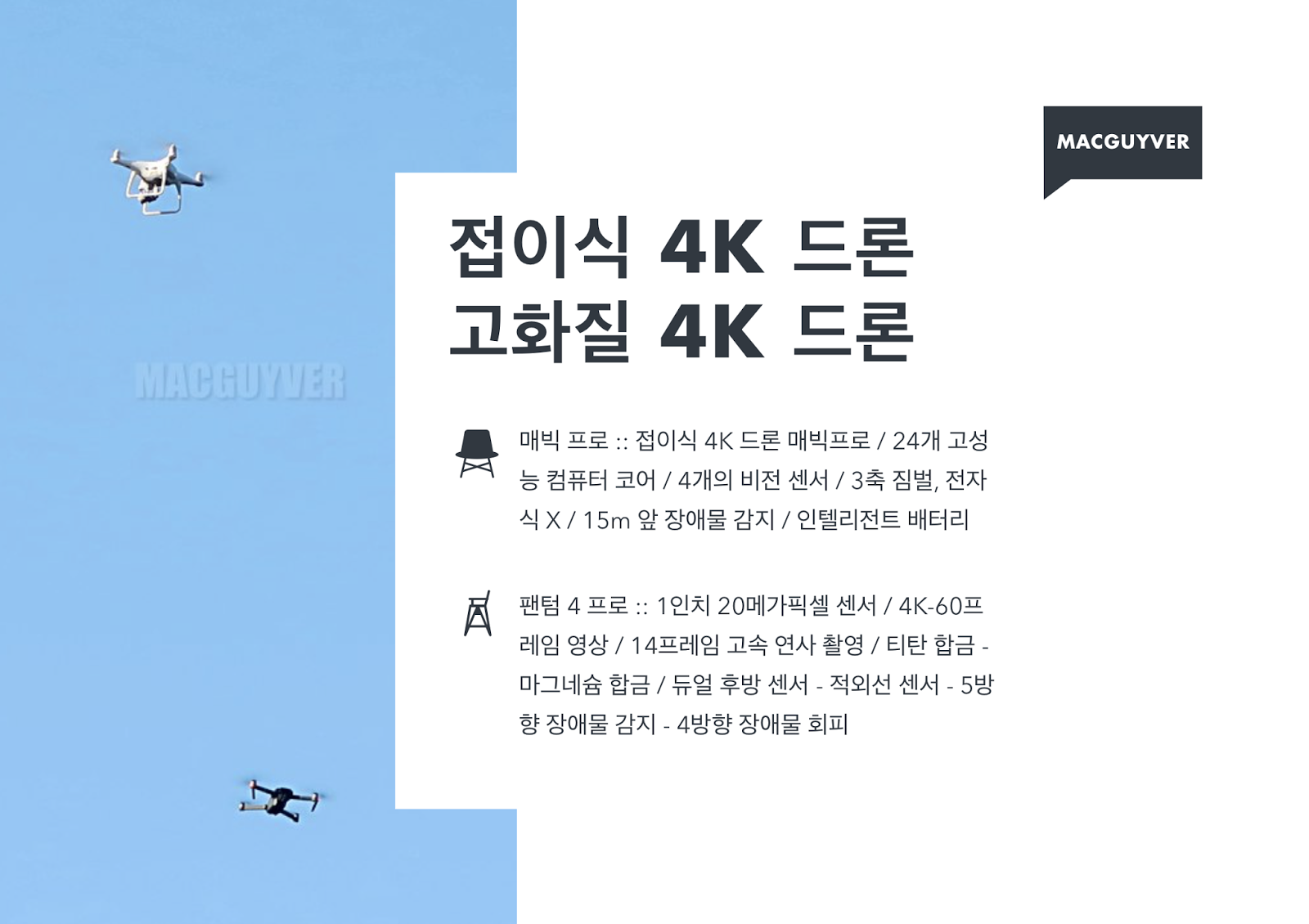 어디든 가지고 다니면서 부담 없이 촬영하기 위한 드론을 찾았다면 매빅 프로를, 어딘가로 ‘촬영’을 목적으로 떠나려는 분들이라면 팬텀 4 프로를 선택하는 것도 좋을 것 같았습니다. 형제의 난이라고 불러야 하는 이번 비교를 통해 2가지 매력을 지닌 드론을 비교해보는 시간이었습니다. - MACGUYVER.