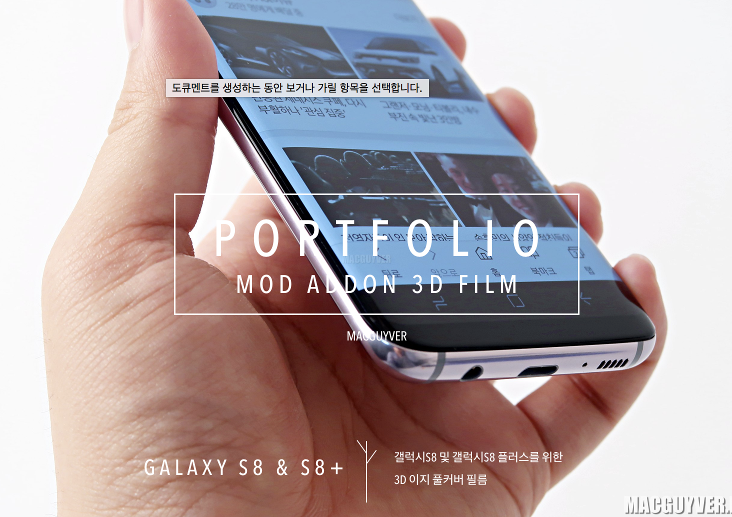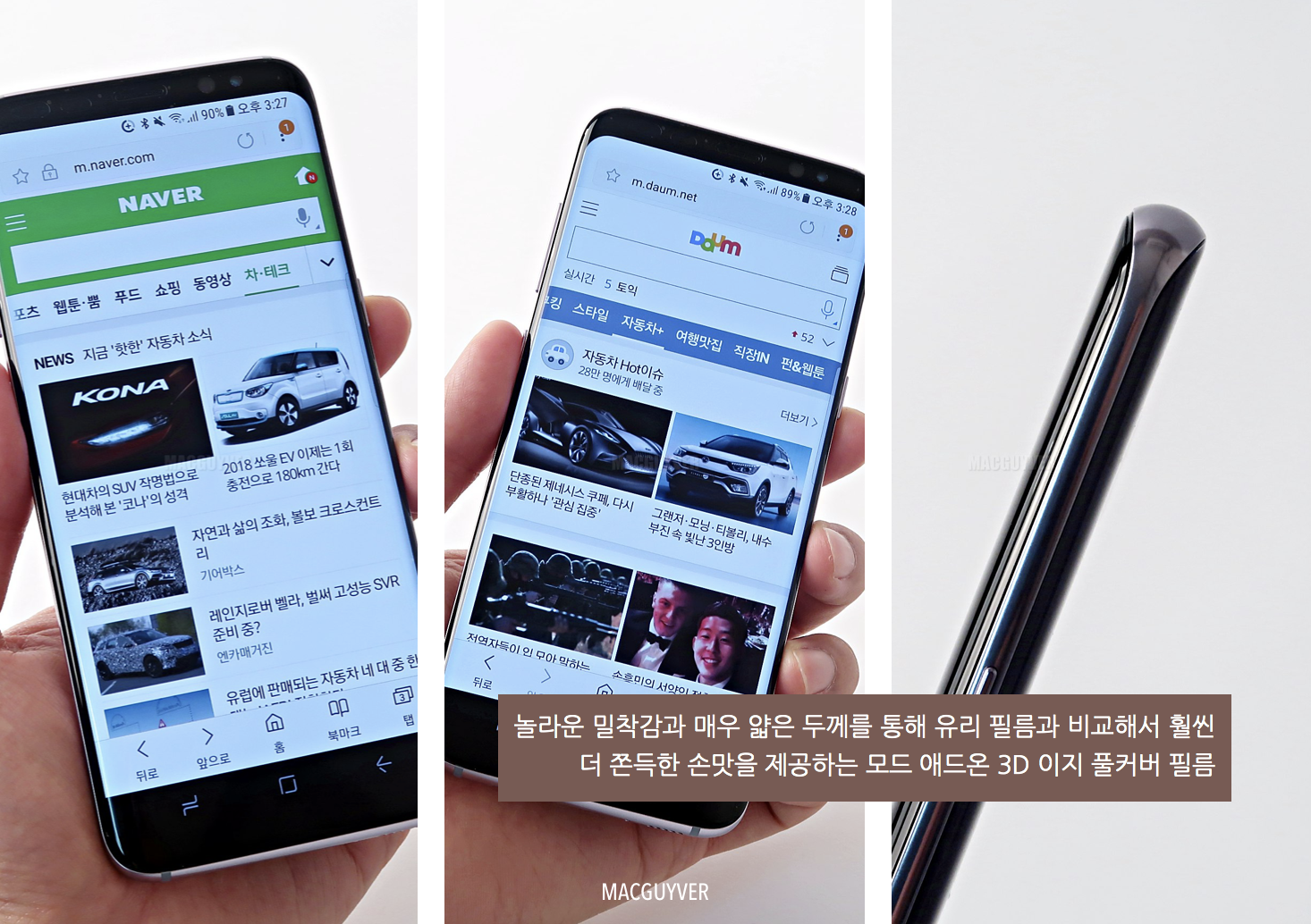 물론 그런 점들을 크게 신경쓰지 않는 분들도 계시지만, 만약 그런 점들이 거슬리는 분들이 계신다면 갤럭시S8 플러스의 곡면까지 덮어주는 풀커버 필름인 모드 애드 온 3D 이지 필름이 좋은 선택지가 되어 줄 것 같습니다.