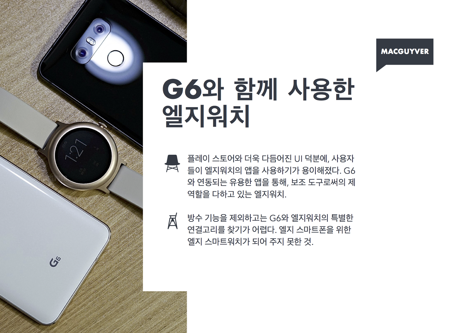 이처럼 엘지워치는 스마트폰을 보조하는 역할에서, 그리고 사용자 친화적인 사용성에서는 만족스러웠고, G6와의 사용에서 특별한 차이를 보여주지 못한다는 점에서는 아쉬웠다는 평가를 내릴 수 있을 것 같습니다. - MACGUYVER.