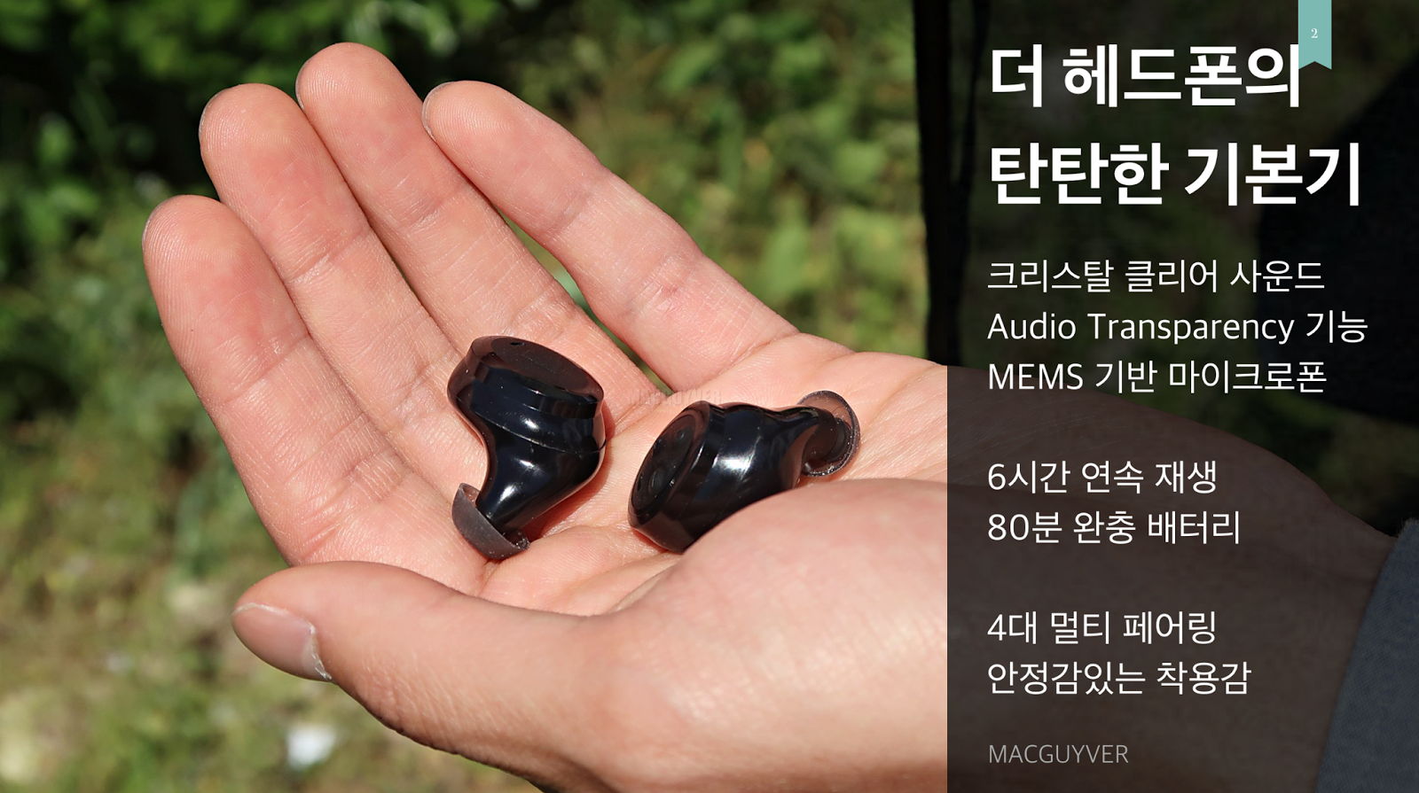 완전 무선 이어폰임에도 더 헤드폰은 핸즈프리 통화가 가능한데요, 뛰어난 오디오 성능이 필요한 모든 분야에 매우 적합하다고 평가받았던 MEMS 기반의 마이크로폰을 탑재했습니다.