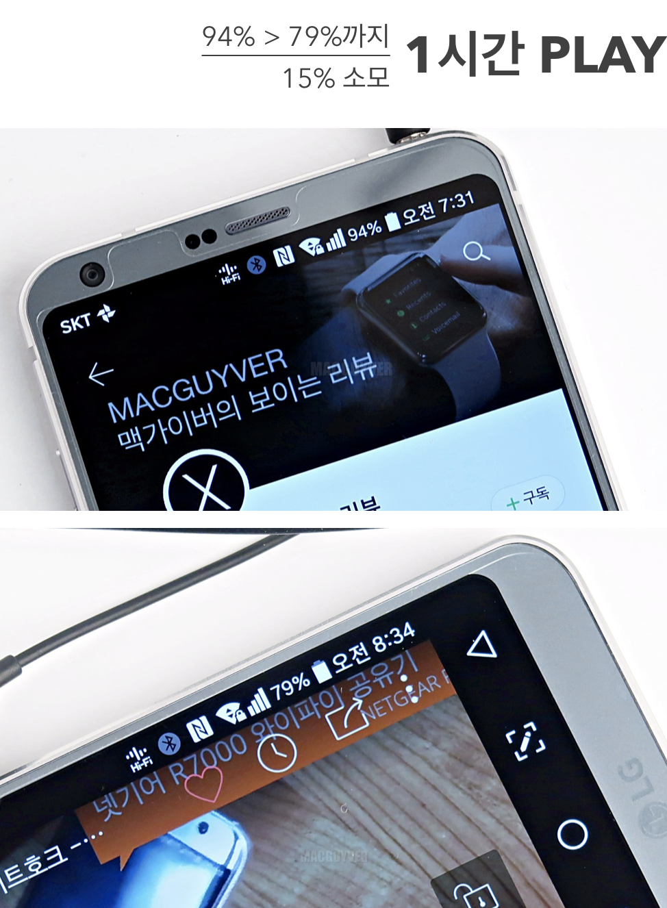 즉, 7시간 동안 LTE 통신망을 통해 하이파이로 감상한 G6의 배터리가 20%의 배터리 소모도 하지 않은 것이다.