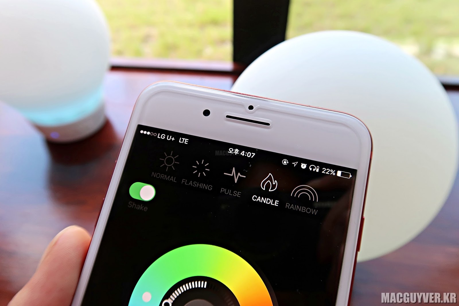 그리고 센터를 보면 LED의 전원을 on/off 할 수 있는 버튼과 색감을 1600만 가지로 세밀하게 조절해 볼 수 있는 원형 구조가 있습니다. 그리고 그 사이에는 밝기를 조절할 수 있는 인터페이스가 있습니다. 마치 가스버너에 불을 올리듯 직관적으로 밝기를 조절해볼 수 있는 점이 좋았습니다.