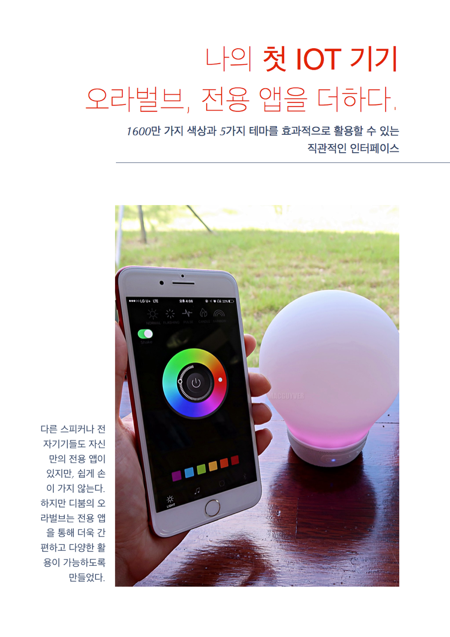 그런데 앞서 IoT기기라고 이야기했죠, 오라벌브는 이러한 설정들을 모두 스마트폰 전용 앱을 사용해 멀리서도 간편하게 조절해볼 수 있습니다.