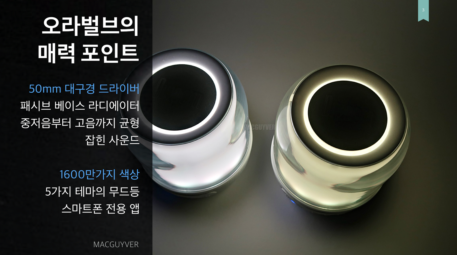 사운드에서부터 LED, 그리고 스마트폰 앱에 이르기까지 마음에 쏙 들었던 오라벌브는 보면 볼수록 새로운 매력 포인트들이 계속 발견되는 가성비 갑 블루투스 스피커가 되어주었습니다. - MACGUYVER.