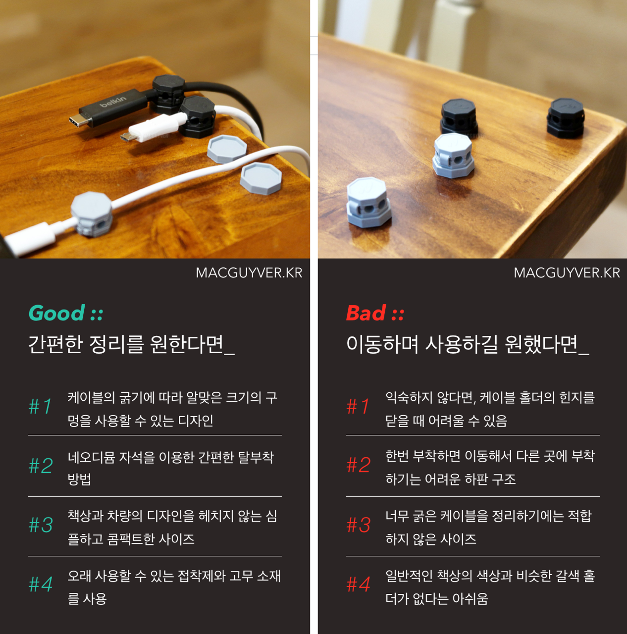 선정리에 효과적이면서 마그네틱으로 사용성까지 편리했던 네오퀵 마그네틱 케이블 홀더는 내 책상 위에, 그리고 가족의 자동차에 하나쯤 붙여둘만한 제품인 것 같습니다. - MACGUYVER.