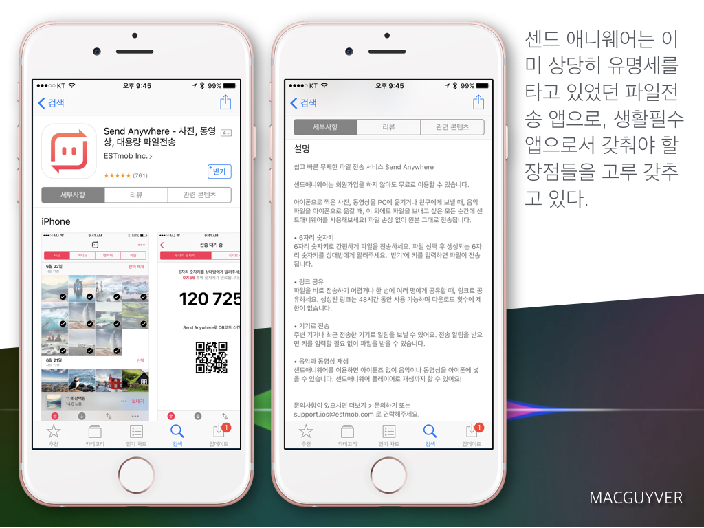 다양한 파일 및 자료를 자주 전송해야 하는 기업에서나, 혹은 친구들이나 지인들끼리 자료를 주고 받고 싶은 경우, 아이폰 백업이나 아이튠즈의 사용이 불편했던 분들에게는 센드애니웨어(Send Anywhere)가 유용한 어플로서, 그리고 생활필수앱으로서 놀라운 역할을 톡톡히 수행할 것 같았습니다. - MACGUYVER.