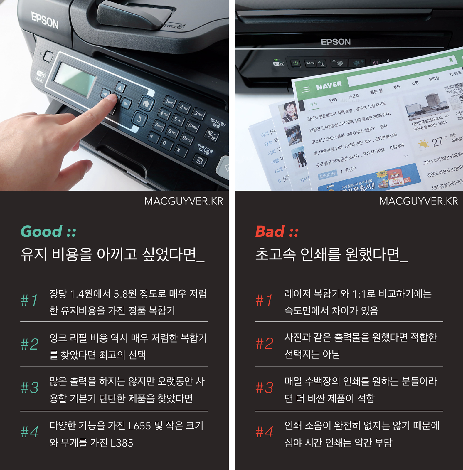 모바일 시대에 발맞춰서 모바일로 시작하고 모바일로 끝내는 Epson iPrint 앱, 그리고 그 모든 기능을 묵묵히 수행하는 엡손 정품 무한 잉크젯 복합기인 L655와 L385를 활용해보는 것도 좋을 것 같습니다. - MACGUYVER.