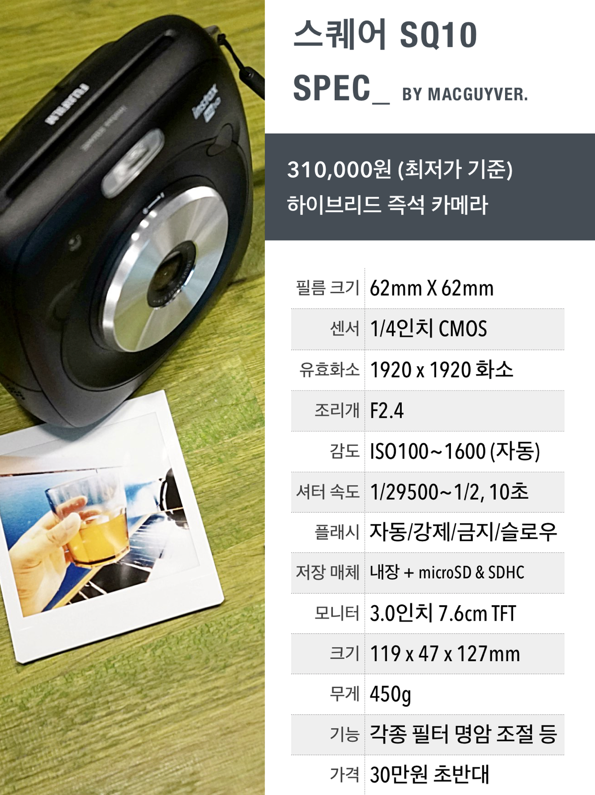인스탁스 스퀘어 SQ10은 인스탁스에서 출시된 제품 가운데 최초로 ‘디지털 기술’을 탑재한 제품입니다. 거기다 첫번째 포맷인 ‘정사각형 필름’을 채택해서 색다른 촬영의 재미를 더해주기도 했습니다.