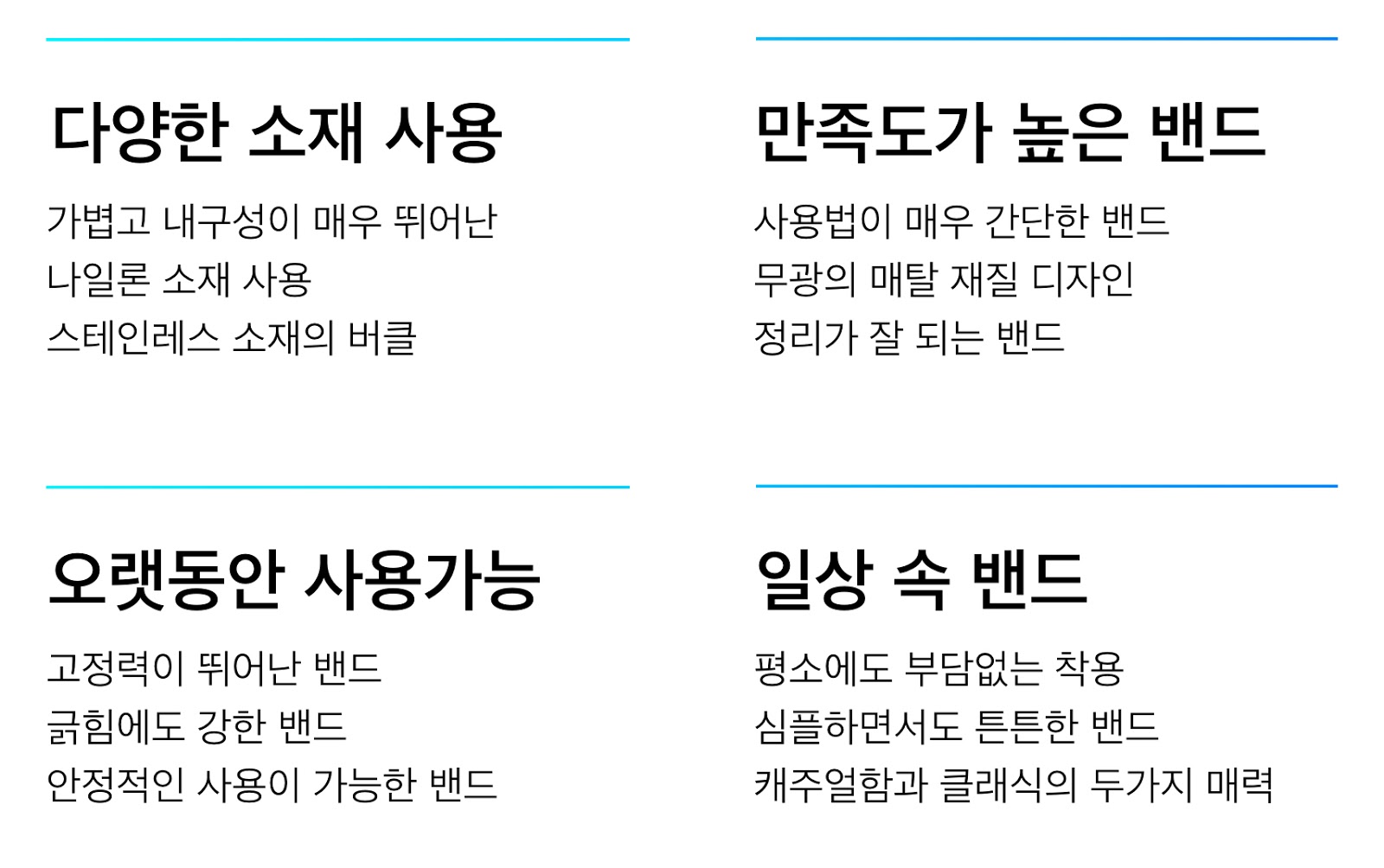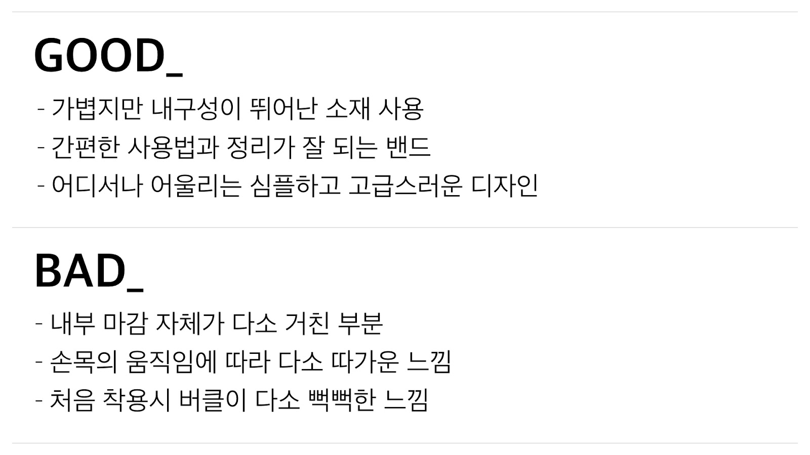 또한 버클로 된 형태의 디자인이지만 사용법이 매우 간단 했고, 손목이 두꺼운 경우에도, 또한 얇을 경우에도 밴드의 끝이 부족하다거나 넘치는 것이 아닌, 정리가 된다는 점에서 만족도가 높기도 했습니다.