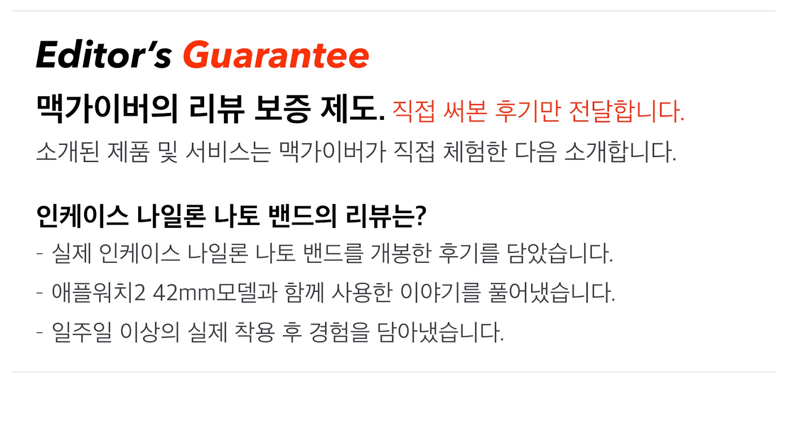 결과적으로 보자면 인케이스 나일론 나토 밴드의 이름은 ‘일상 속 밴드’가 아닐까 싶네요. 일상부터 운동까지 모두 가능한 밴드이기 때문입니다. - MACGUYVER.