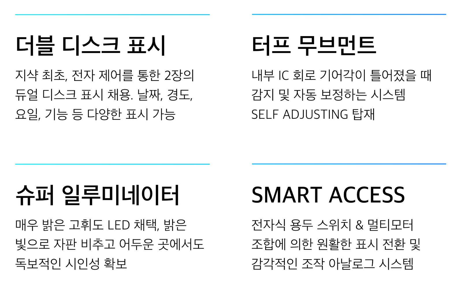 카시오 社의 기술력인 스마트 액세스 기능 역시 탑재되어 있다. 이 기능은 시,분,초 침 등 모든 물리적인 바늘들을 독립구동할수 있는 엄청난 진보된 기술이며 이 기능으로 인해 사용자는 시각보정이나 기능 엑세스 시에 기다릴 필요가 전혀 없는 극도의 직관적 기능이라 할 수 있겠다.