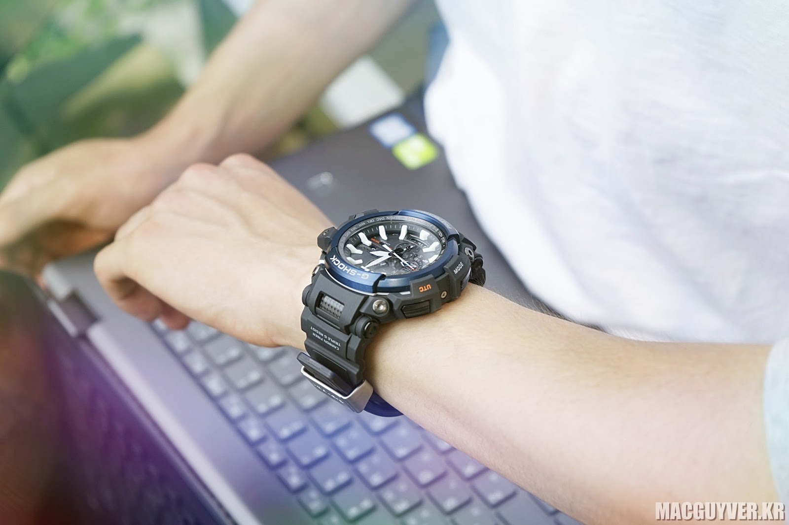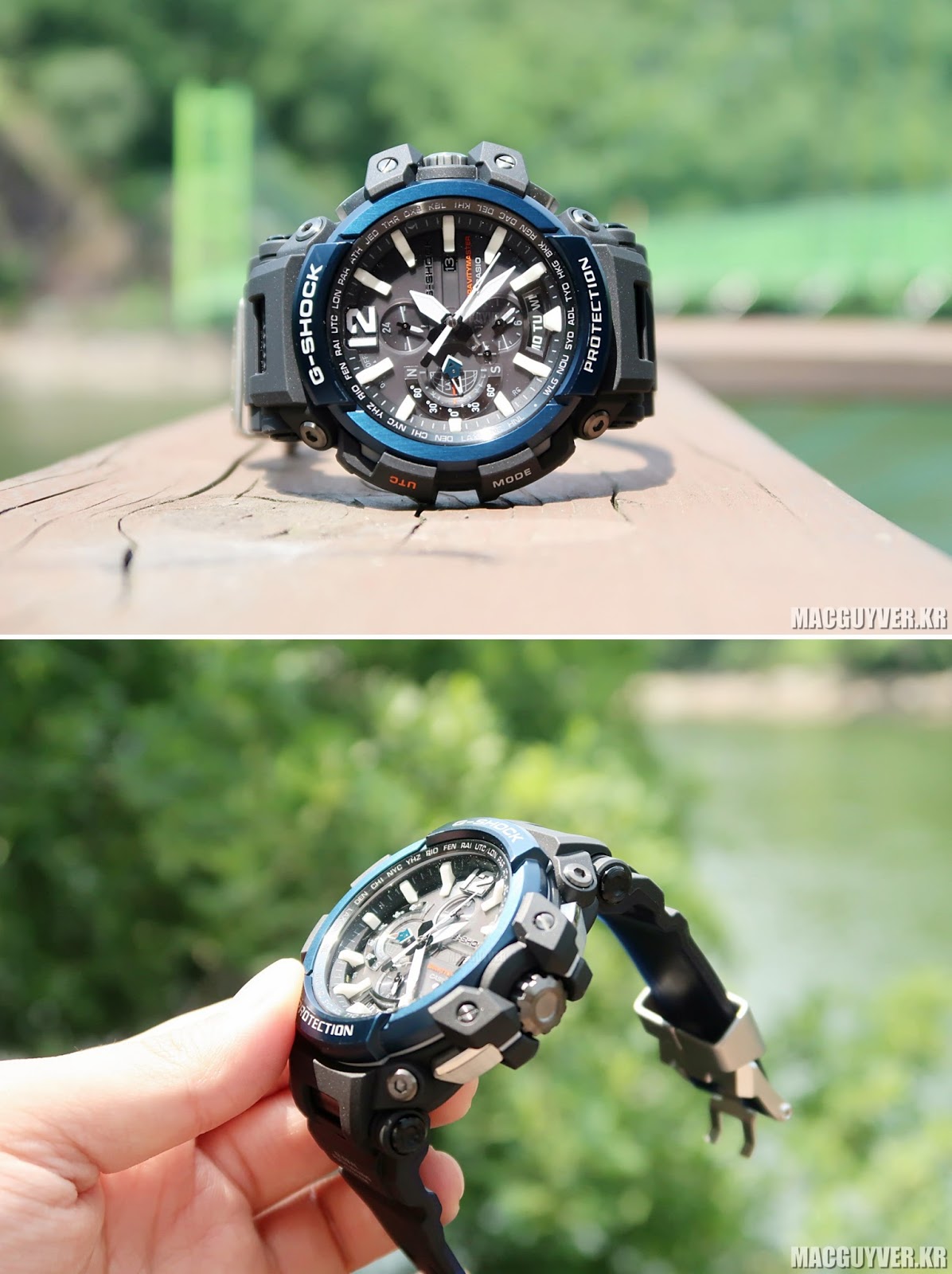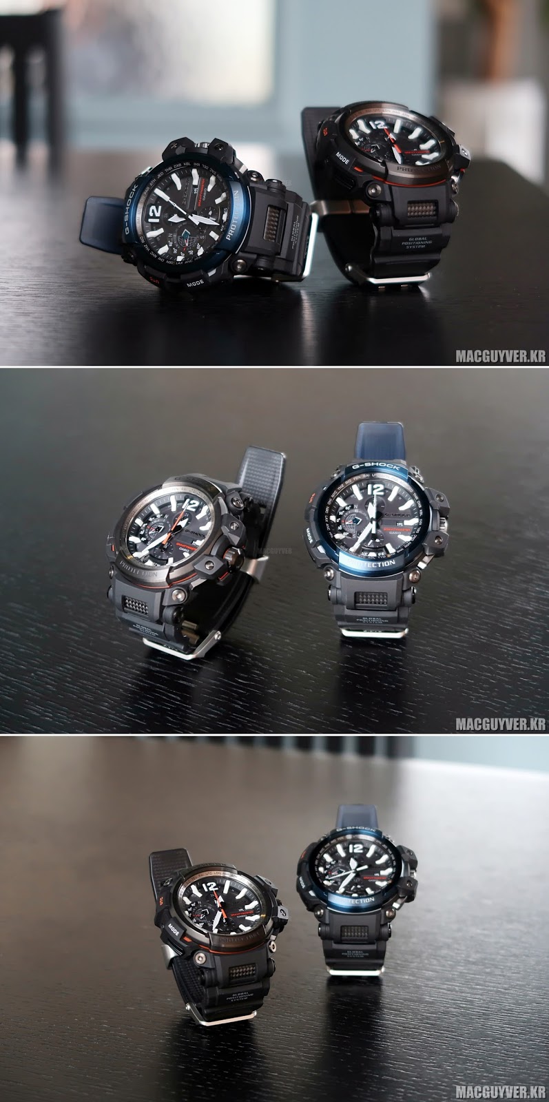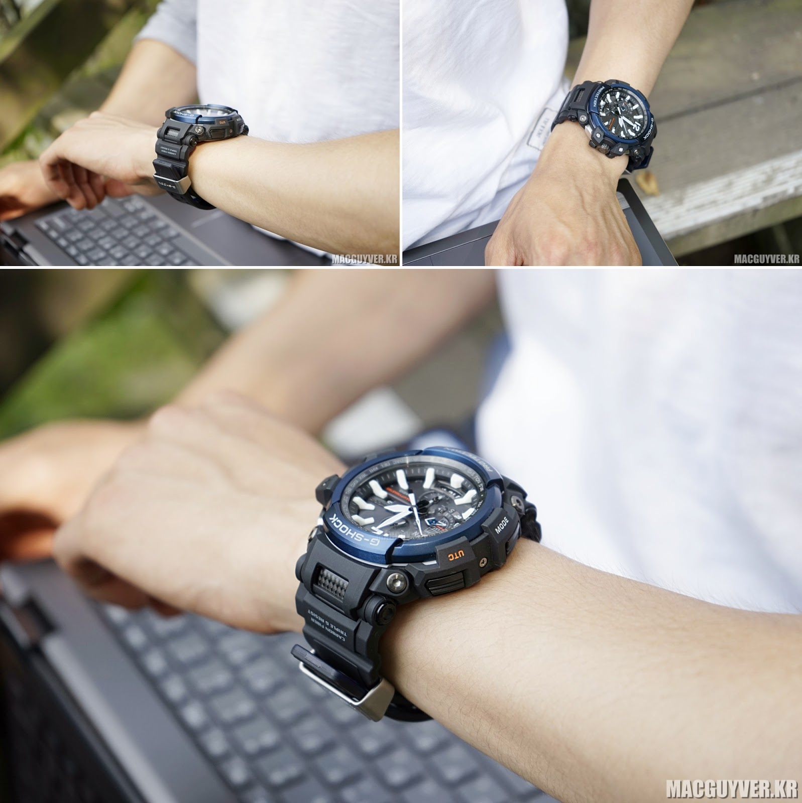 개인적으로는 지샥 GPW-2000-1A2DR 모델의 컬러감이 더 돋보였는데, 우선 전체적으로 블랙 & 스틸 컬러감으로 마감된 디자인에 더해서 푸른색의 고급스러운 링으로 포인트를 줬기 때문에 세련된 느낌과 함께 내부적으로도 조화가 잘 되어 있어서 눈길을 끄는 컬러라는 생각이 들기도 했다.