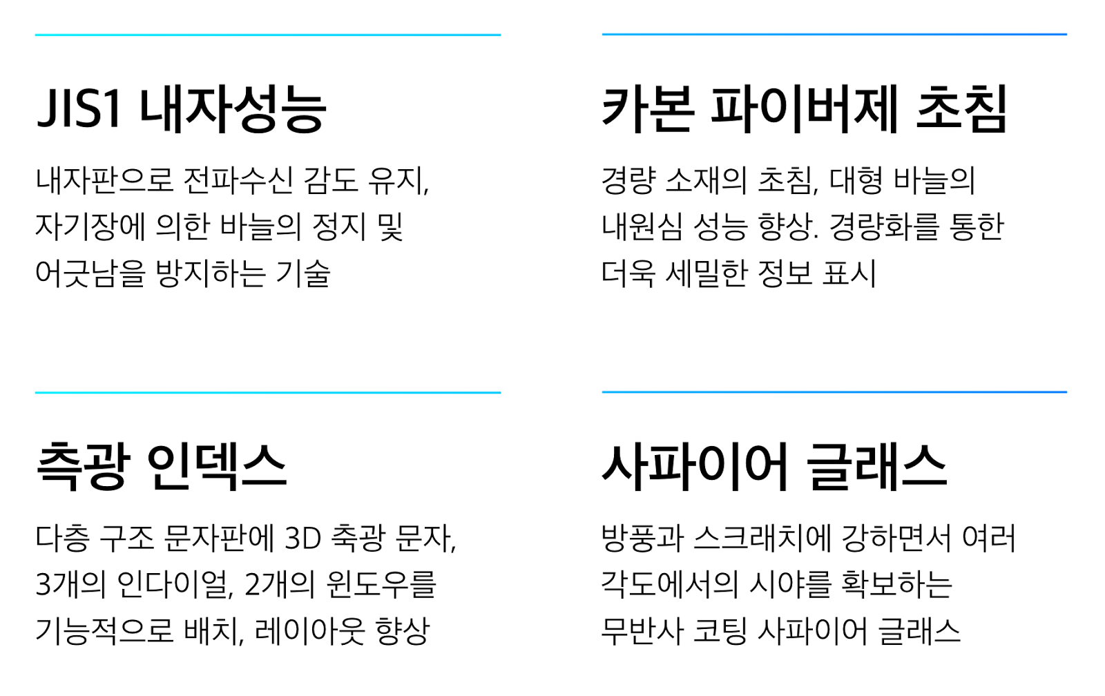 이외에도 JI S1 내자성능으로 자기장으로 인한 바늘이 멈추는 증상이나 어긋나는 증상을 예상하고, 대형 입체 측광 인덱스로 시인성을 향상하기도 했다.