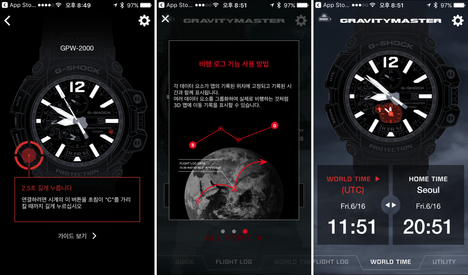 마지막으로 블루투스 기술을 통해 스마트폰과의 연동까지 추가하고 있는 지샥 GPW-2000은 타임존을 넘어섰을 경우 블루투스 연동 시 자동으로 현지의 시간을 표시하도록 도와주고 있다. 즉, 다양한 국가를 자주 오고가는 경우 현지 시간으로 다시 맞출 번거로움이 없어지는 것이다.