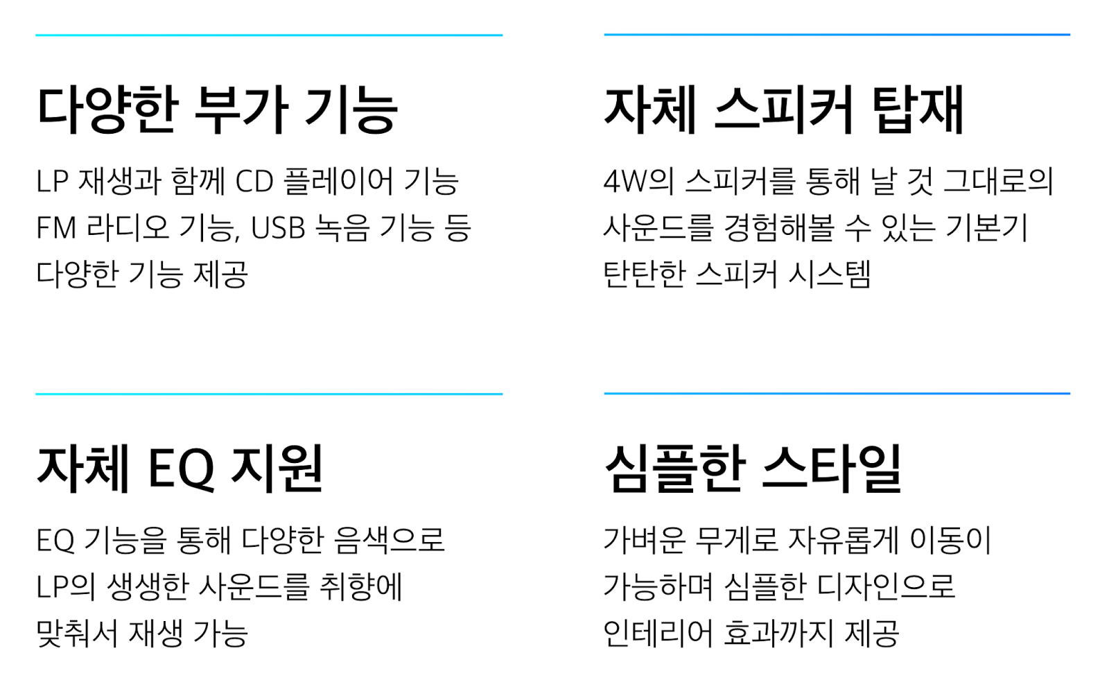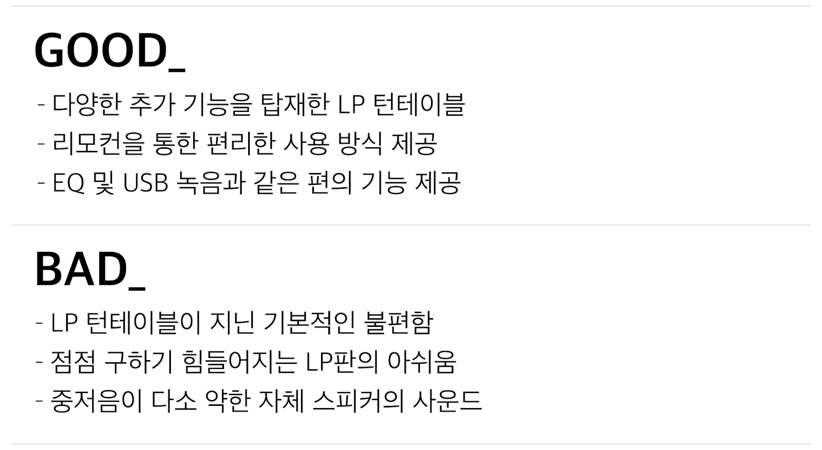 거기다 거대한 원형의 LP를 구입하고 보관하는 과정도 필수적이며, 심지어 앞면과 뒷면을 자동으로 재생해주는 기능도 없으니 직접 손으로 LP판을 뒤집어줄 필요도 있기 때문입니다.
