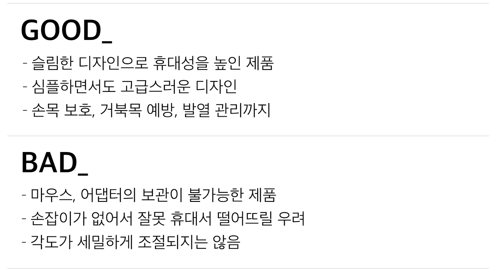 슬림한 디자인을 위해 얇게 디자인이 되어서 마우스를 보관할 수가 없으니 마우스나 어댑터를 휴대하기 위해서는 별도의 파우치나 가방은 필수적입니다.