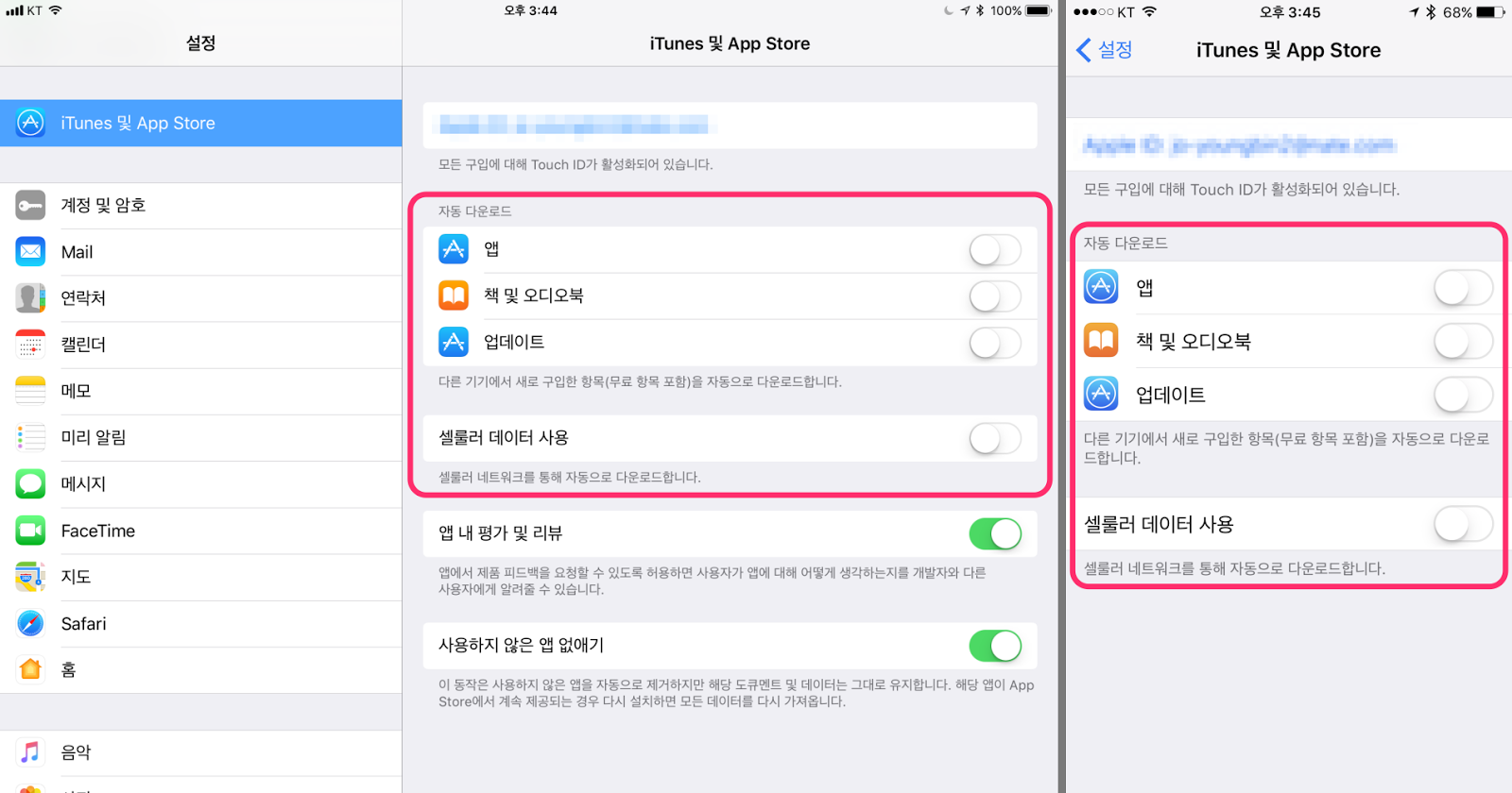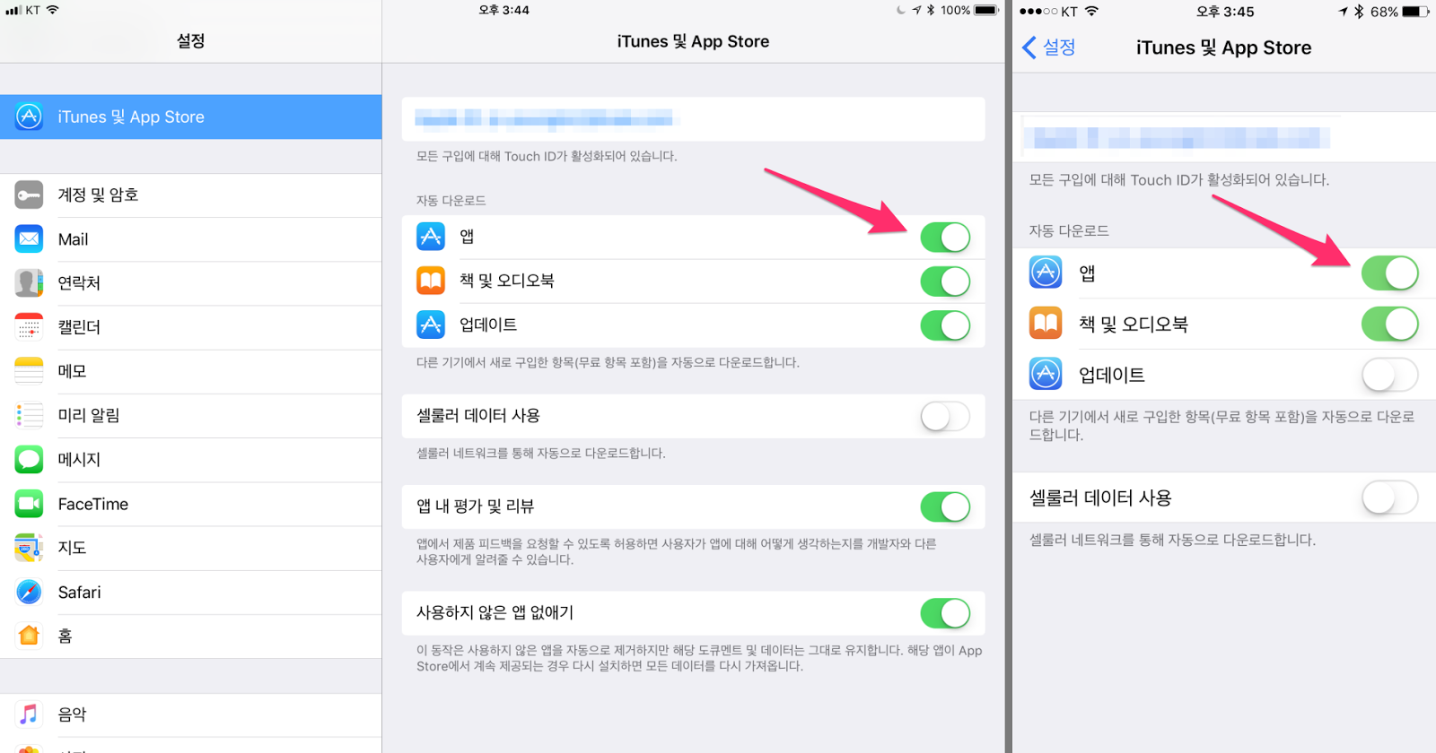 또한 단순히 '앱' 뿐만 아니라 '책 및 오디오북'과 '업데이트' 또한 설정을 변경하게 되면 자동으로 설치되거나 업데이트가 되는 것을 예방할 수 있습니다.