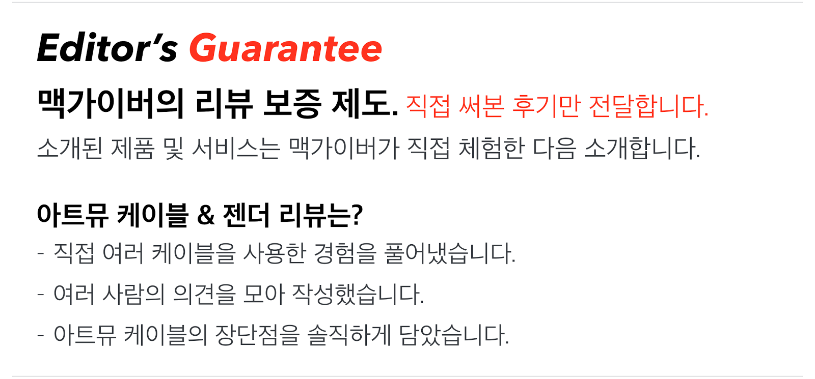앞으로 출시할 케이블까지 기대하게 만들 정도로 뛰어난 내구성과 제대로 된 성능을 품고 있으면서도 합리적인 가격에 만나볼 수 있었던 아트뮤 케이블은, 집이나 사무실에서 사용하고 있던 그저 그런 케이블을 대체하기에 아주 적합한 아이템이 아닐까 싶습니다. - MACGUYVER.