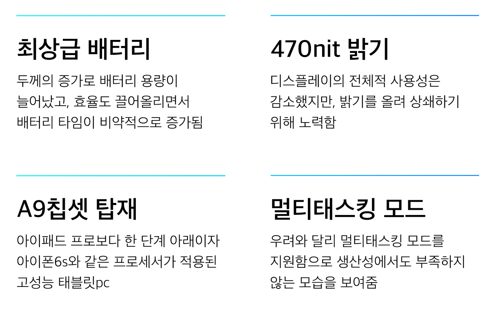 에어2는 트리플 코어로 된 A8X가 사용되었는데요, 뒷소문으로는 에어2에 프로라는 네이밍을 달고 출시하려는 시도가 있었지만 실패했다는 이야기가 나오기도 했습니다. 그만큼 프로세서 성능이 비약적으로 발전했던 것이죠.