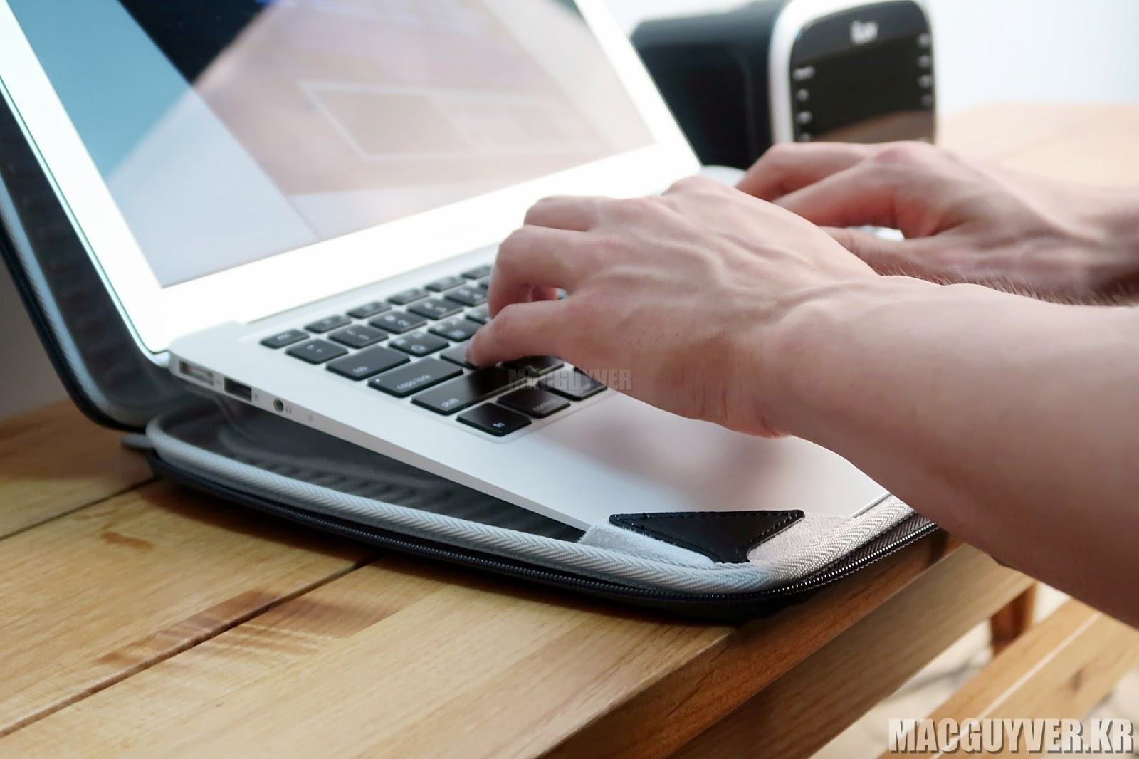 그리고 단순히 노트북용 가방처럼 휴대하는 것에서 그치는 것이 아니라 맥북을 사용할 때 노트북 거치대의 역할도 합니다.