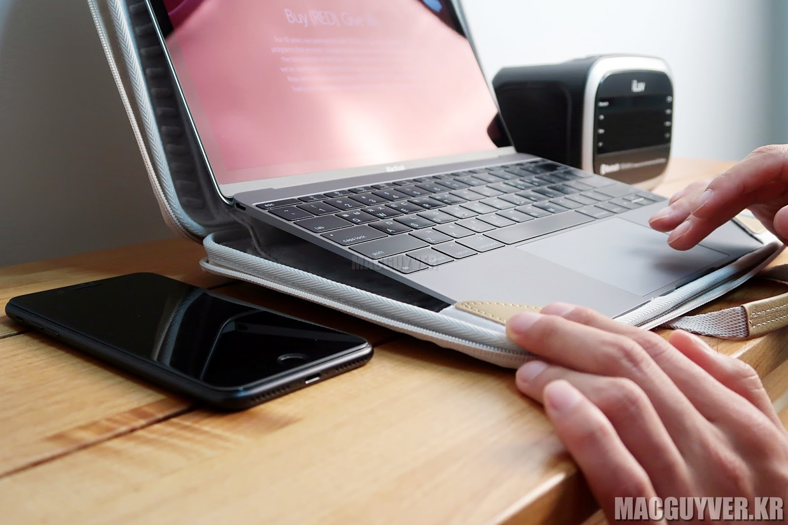 그리고 12인치 맥북의 경우 힌지가 상당히 약합니다. 반면 이 하드 케이스는 닫는 힘이 꽤나 센 편입니다. 그래서 케이스에 거치한 채 12인치 맥북을 사용하고 싶다면 구입하고 하루나 이틀정도 가방을 다 펼친 상태에서 위에 무거운 것을 올려두고 길들일 필요가 있다고 합니다.
