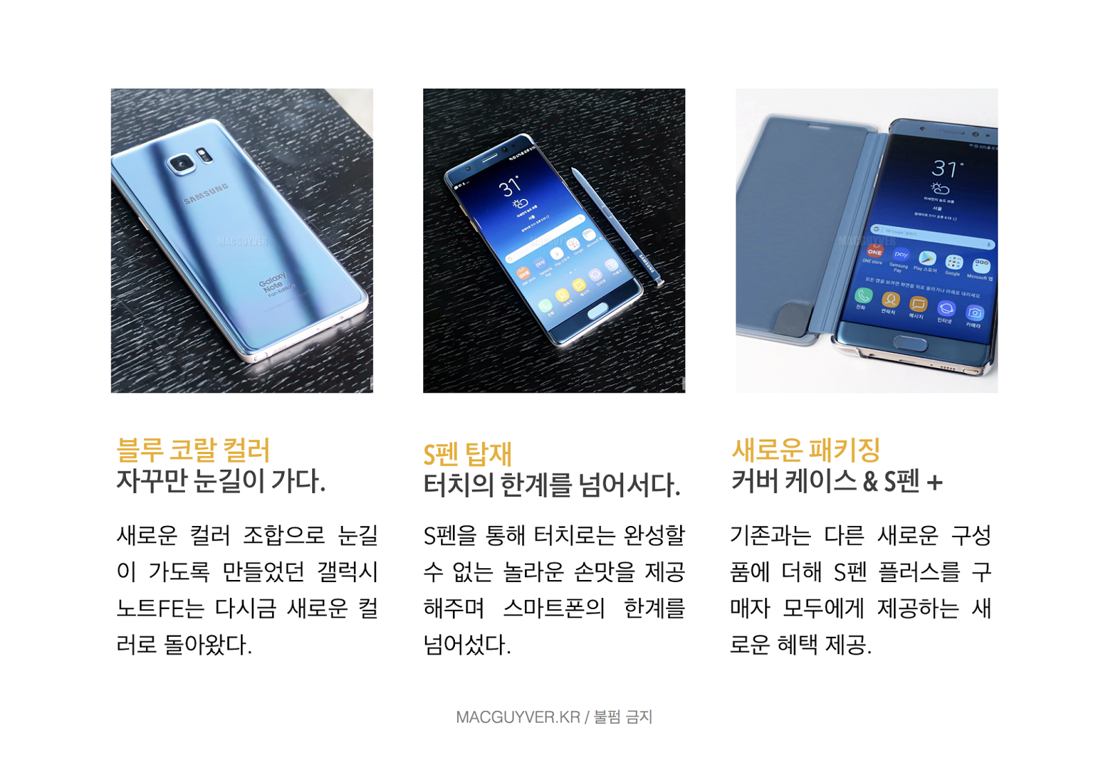 아무렴 어떨까요. 지난해 발화 이슈 속에서도 끝끝내 폰을 내어주기 싫어했던 그 폰이라는 사실에는 변함이 없고, 갤럭시노트FE의 홈 버튼이나 깔끔한 디자인, S펜을 통한 추가 기능에 더해서 블루 코랄 컬러는 갤럭시노트FE를 구매할 수밖에 없도록 만들었기 때문입니다.