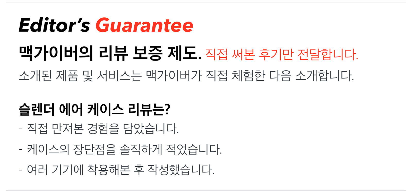 조금의 아쉬운 점도 분명 있었지만 훌륭한 가성비와 슬렌더 에어 케이스만의 차별화 요소가 자신에게 적합하다고 생각된다면, 장바구니에 넣어볼 만한 제품이 아닐까 싶습니다. - MACGUYVER.