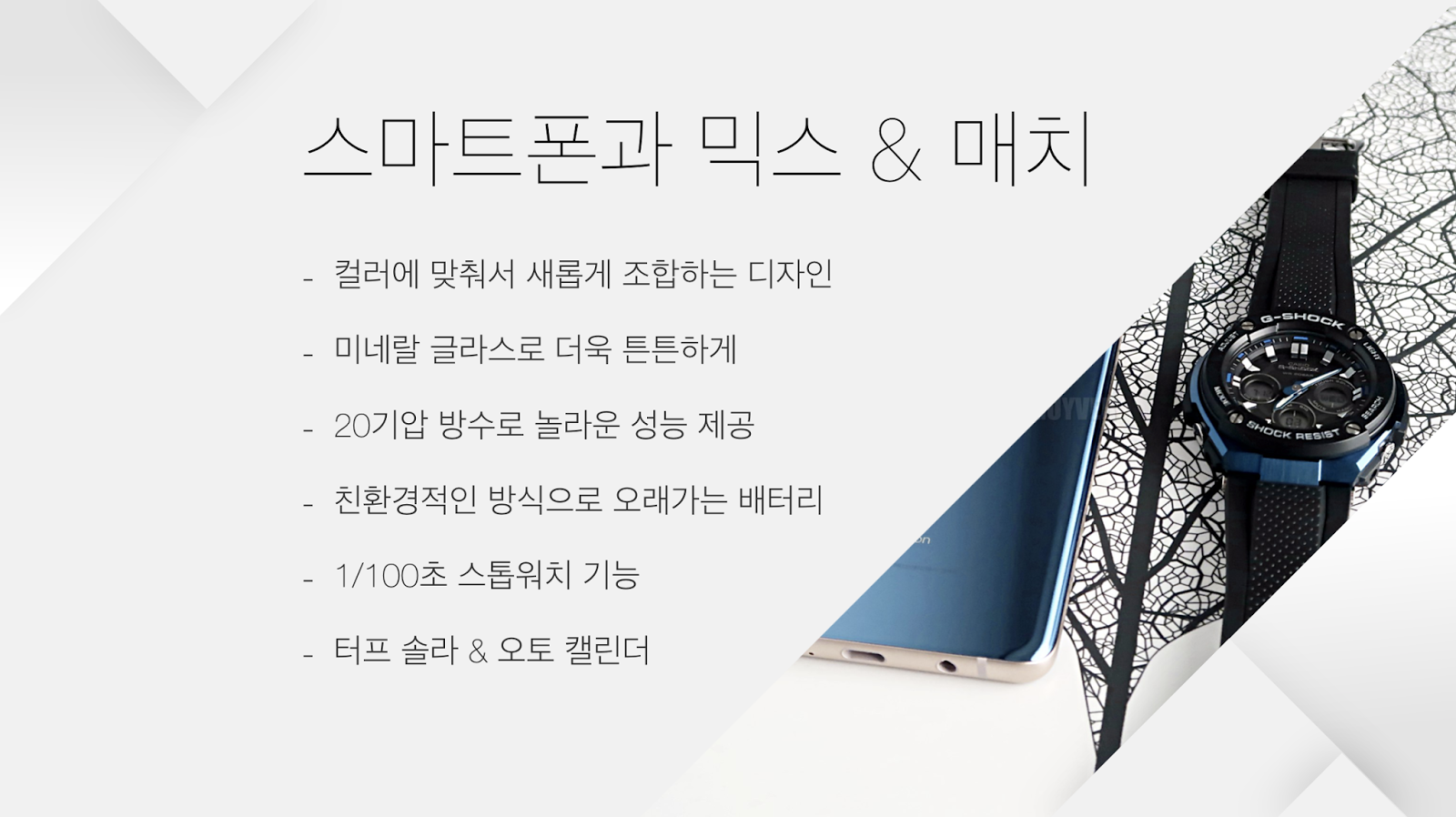 디자인이나 퍼포먼스, 놀라운 기본기는 그대로 갖추고 있지만 90%까지 크기를 줄이면서 경량화에 성공했기 때문이다. 또한, 거칠어 보이는 외관의 모습과는 전혀 반대로 내장되어 있는 사양들은 사용자의 편의를 위한 카시오 사의 최신 기술들이 잘 녹아있는 ‘반전 매력’을 가지고 있는 제품이라 하고 싶다.