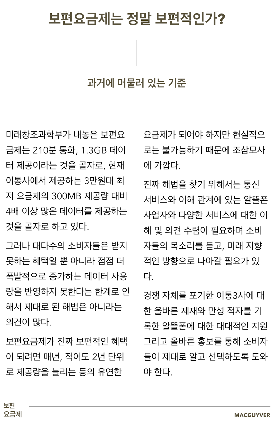 대다수의 소비자들이 원하는 혜택도 아닌 보편요금제로 이통사의 반발을 사고 소비자들의 비난을 받을 것이 아니라 제대로 된 시장 조사와 소비자들의 목소리를 듣는 정책이 나오기를 기대해봐야겠다. - MACGUYVER.