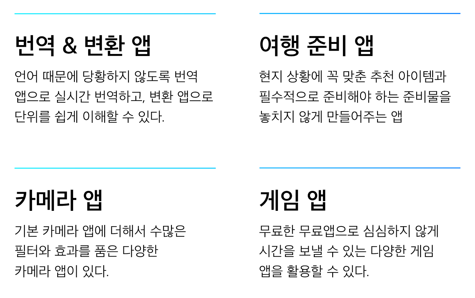그렇다 하더라도 스마트폰은 꼭 챙겨가게 되는 여행인 만큼, 유용하고 쓸모있는 앱을 미리 알아두고 준비하는 것은 여행의 재미를 더해주고 혹시 모를 문제를 예방하는 좋은 준비가 될 것도 같습니다.