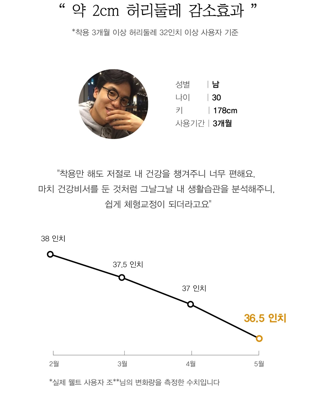 즉, 크게 신경을 쓰지 않아도 허리 둘레를 줄일 수 있을 뿐 아니라, 호기심에 구입해서 사용하다가 결국 사용하지 않게 되는 스마트워치 및 밴드와는 달리 지속적인 사용 비율이 매우 높다는 실험 결과에서 알 수 있는 것처럼, 지속적인 건강 관리가 가능한 제품이기 때문입니다.
