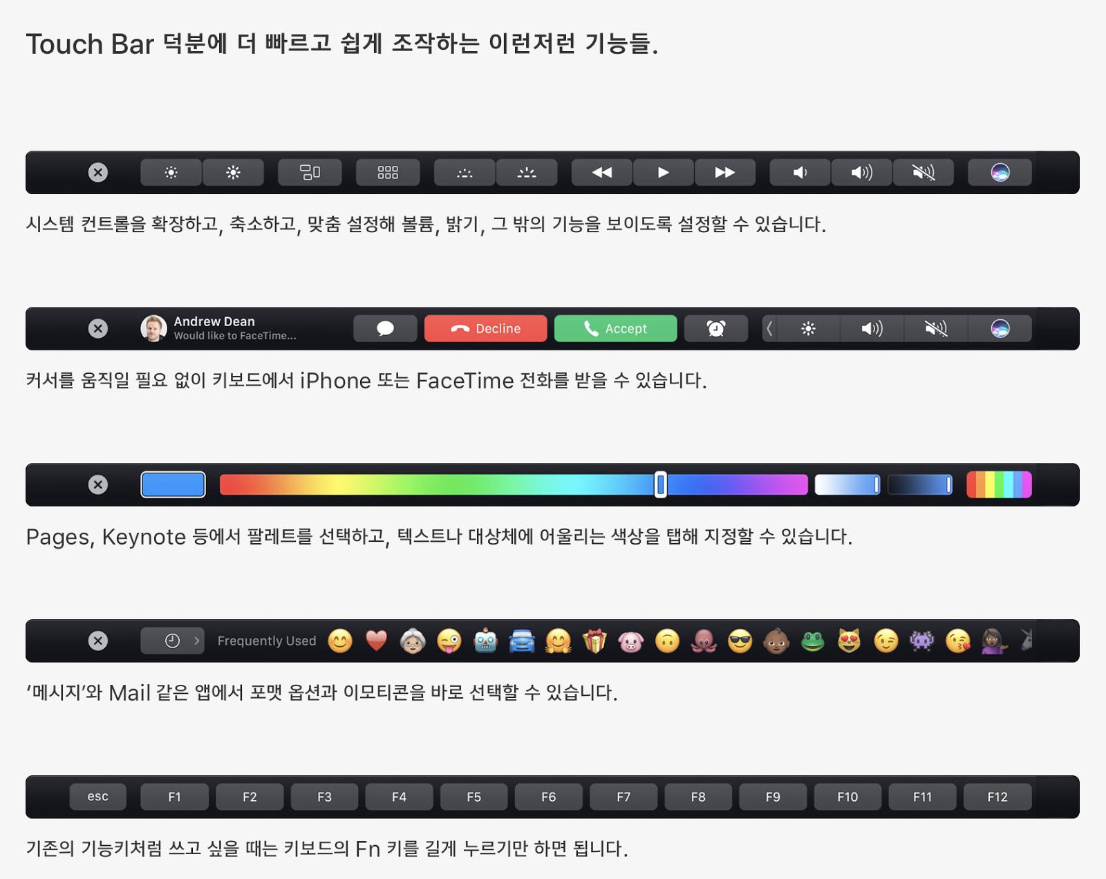 그에 더해서 터치 바는 오직 맥북 프로 시리즈에만 있기 때문에 아이맥이나 맥북, 맥북 에어와 같은 제품들로 경험이 이어지지 않는다는 아쉬움으로 인해서 아직까지 손에 쫀득쫀득하게 붙는 느낌이 다소 부족하기도 했습니다.
