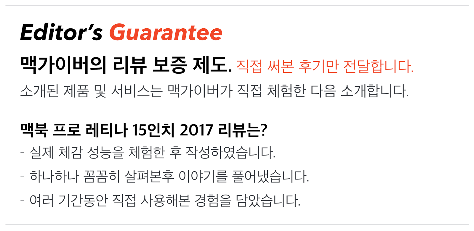 그럼에도 경험을 새롭게 다듬고 내실을 다진 맥북 프로 레티나 15인치 2017 모델은 원하는 작업을 스트레스 없이 수행할 수 있게 해주는 기기임에는 틀림이 없을 것 같습니다. - MACGUYVER.