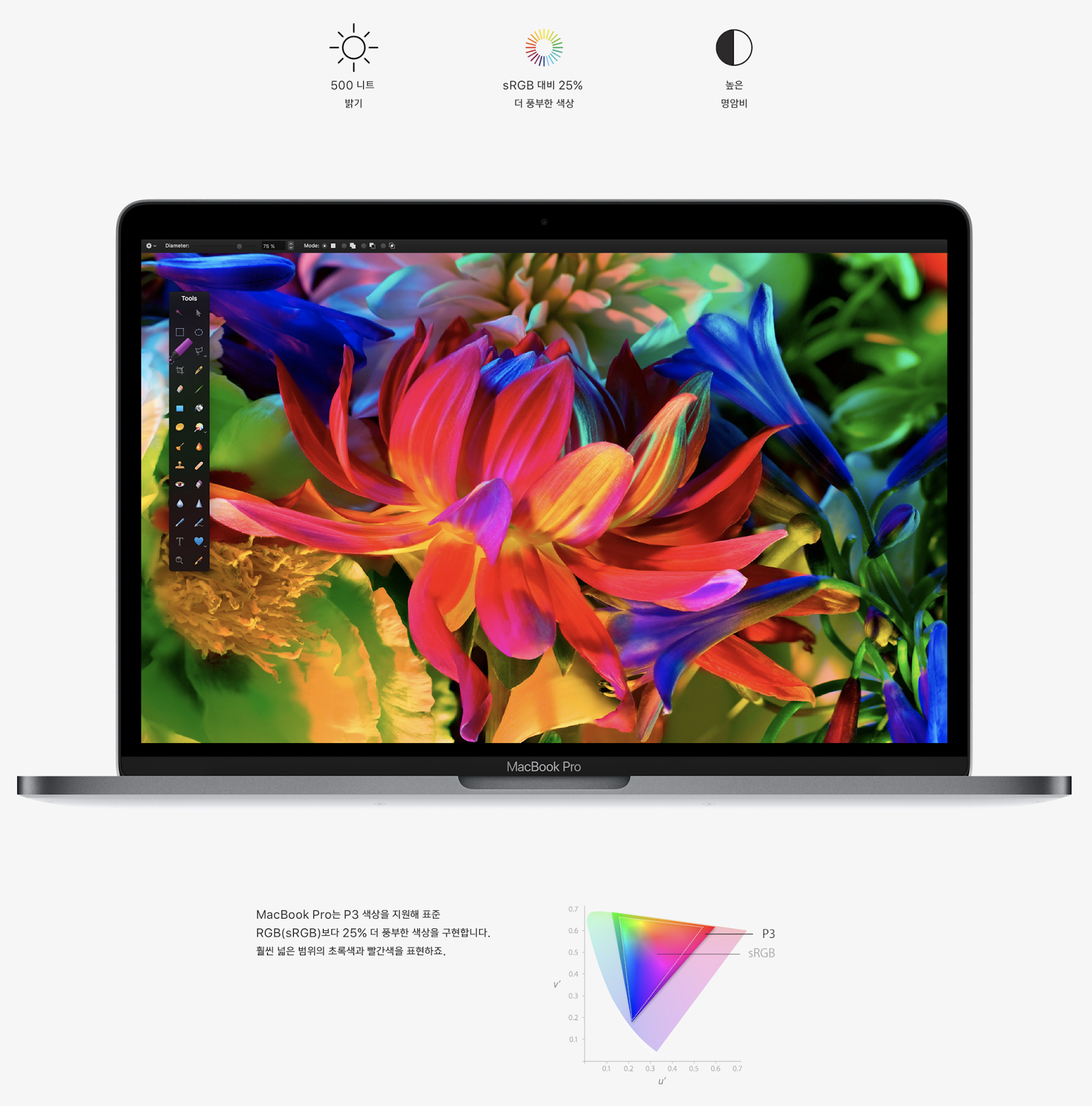 맥북 프로 레티나 15인치 2017 모델의 장점은 또한 디스플레이에도 있습니다. 무려 500니트의 밝기로 야외 작업도 거뜬하기 때문인데요. 거기다 터치 바까지 있기 때문에 직관적인 조작까지 가능하다는 점과 이제 조금이나마 터치할 수 있는 디스플레이가 달렸다는 점에서는 차별화가 되는 것 같았습니다.