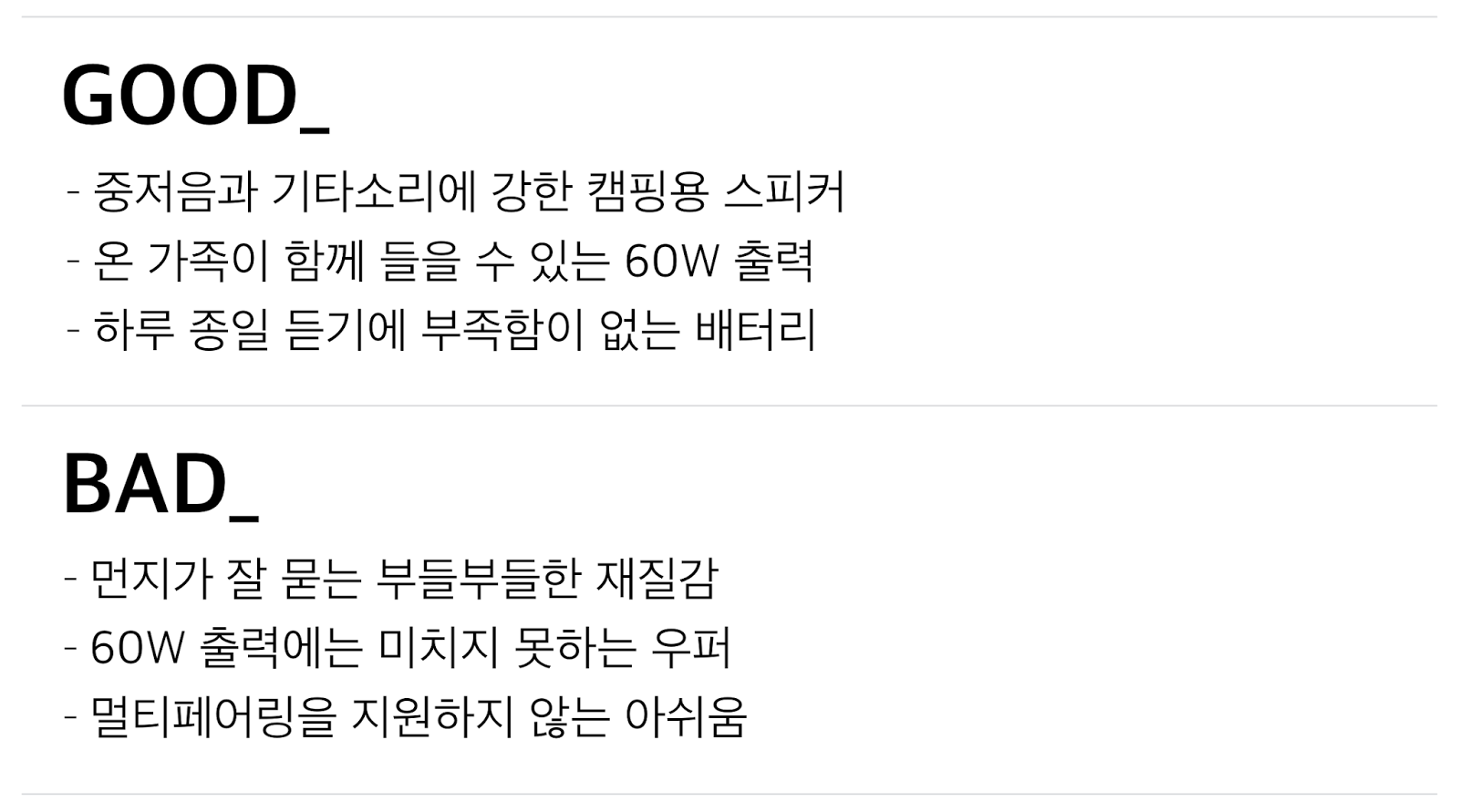 사운드의 스타일은 단단한 중저음에 강한 음색인데요. 2.1채널로 우퍼도 탑재되어 있습니다. 우퍼도 블루투스 스피커로써 제 역할에 충실하긴 하지만, 60W 출력에 비하자면 다소 약할 수 있다는 점은 감안하셔야 할 것 같습니다.