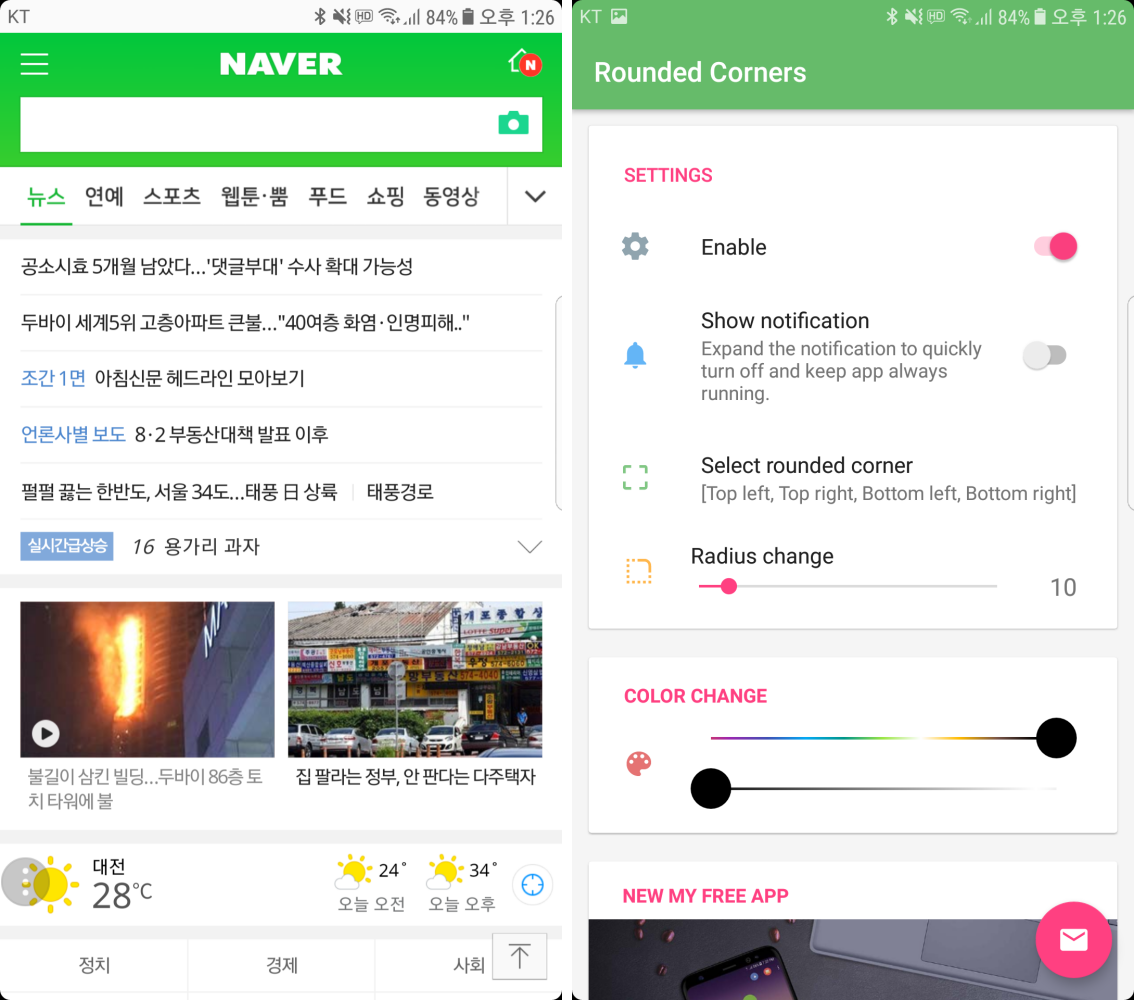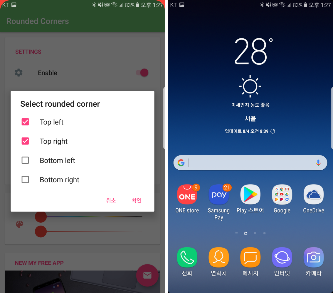 Rounded Corners라는 앱은 안드로이드 시스템 상에서 모서리를 둥글게 만들어줄 뿐 아니라, 사용자가 임의로 곡률을 조절할 수 있기 때문에 자신이 원하는 곡률로 바꿔서 사용할 수도 있었습니다.
