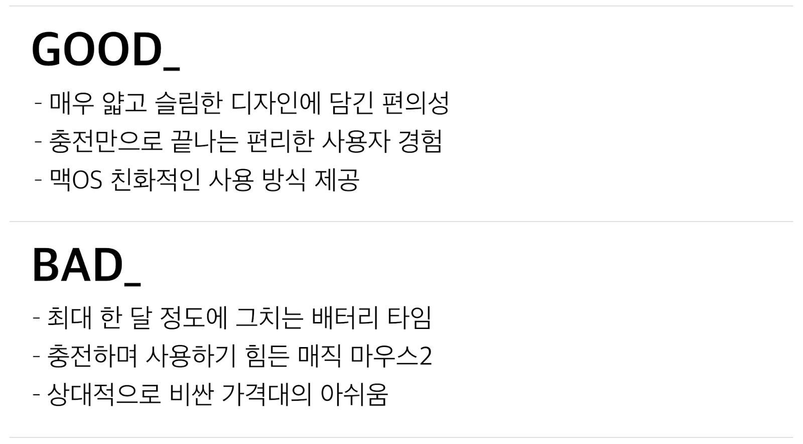 일반적인 휠 타입의 마우스에서는 느껴볼 수 없는 터치 방식의 마우스로서, 좌/우 클릭뿐만 아니라 다양한 제스처까지 지원하기 때문에 매직 마우스2는 때때로 매직 트랙패드2를 완벽히 대체할 수도 있을 정도로 만족스러운 사용이 가능했기 때문입니다.