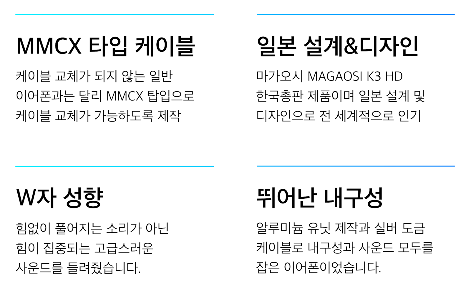 중저음부터 초고음까지 매우 맑으면서도 시원한 사운드를 전달해주는 것이 특징인 MAGAOSI K3 HD는 이어팁을 바꾸는 것만으로도 음악적인 성향을 완전히 바꿔주기 때문에 매칭 감상이 가능하다는 장점 또한 지녔습니다.