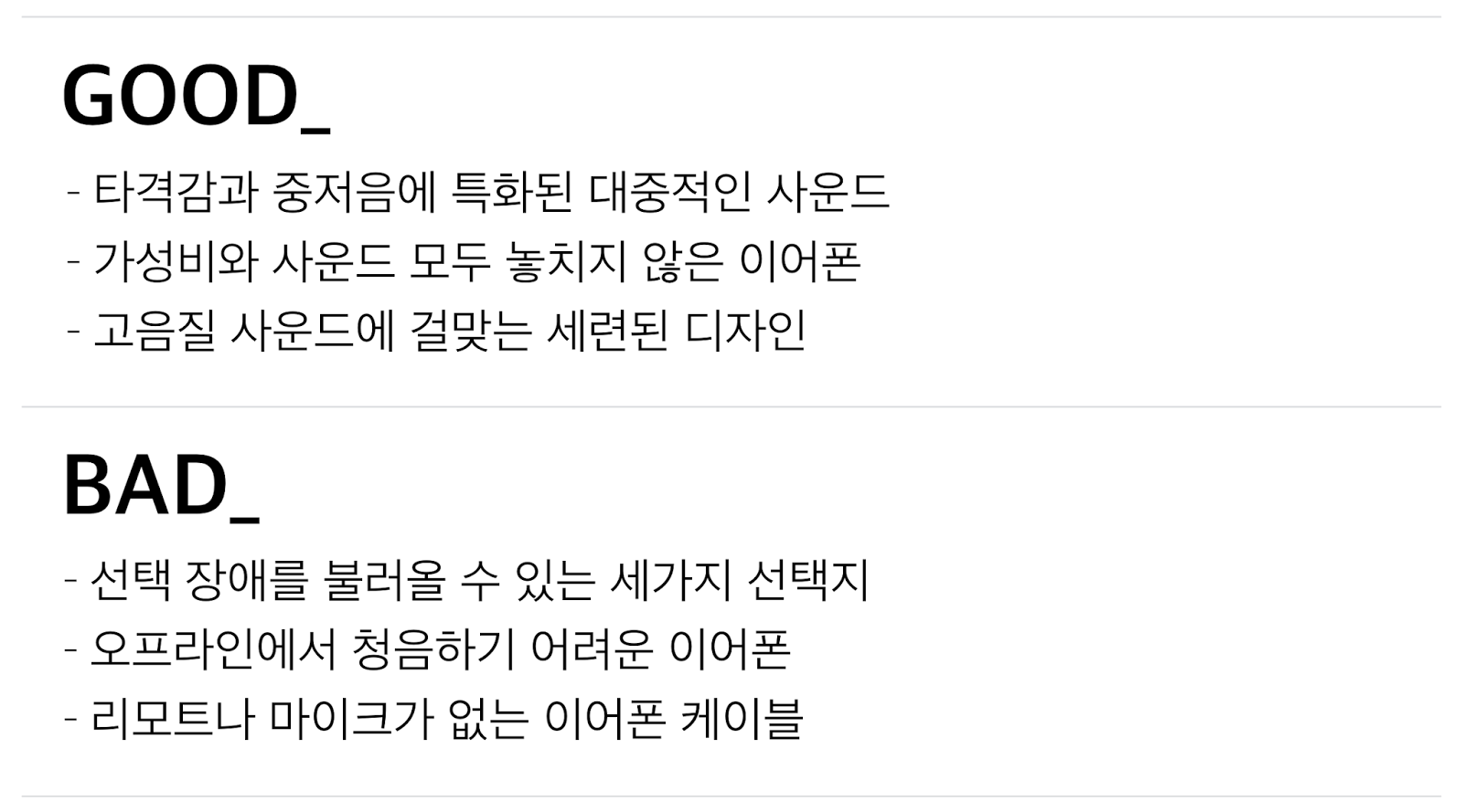 보컬의 사운드를 가장 잘 살려주는 이어폰이라 하기에는 조금이나마 부족한 면이 있겠지만, 배경음악의 타격음을 즐기는 분들에게는 좋은 선택지가 될 것 같습니다.