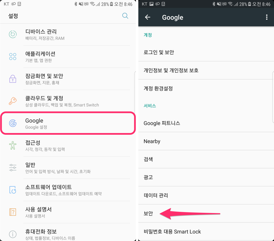 구글 플레이 프로텍트는 설정 항목에서 구글 > 보안 섹션에서 확인이 가능하며, 여기에서 보안성을 더욱 강화할 수도 있다.