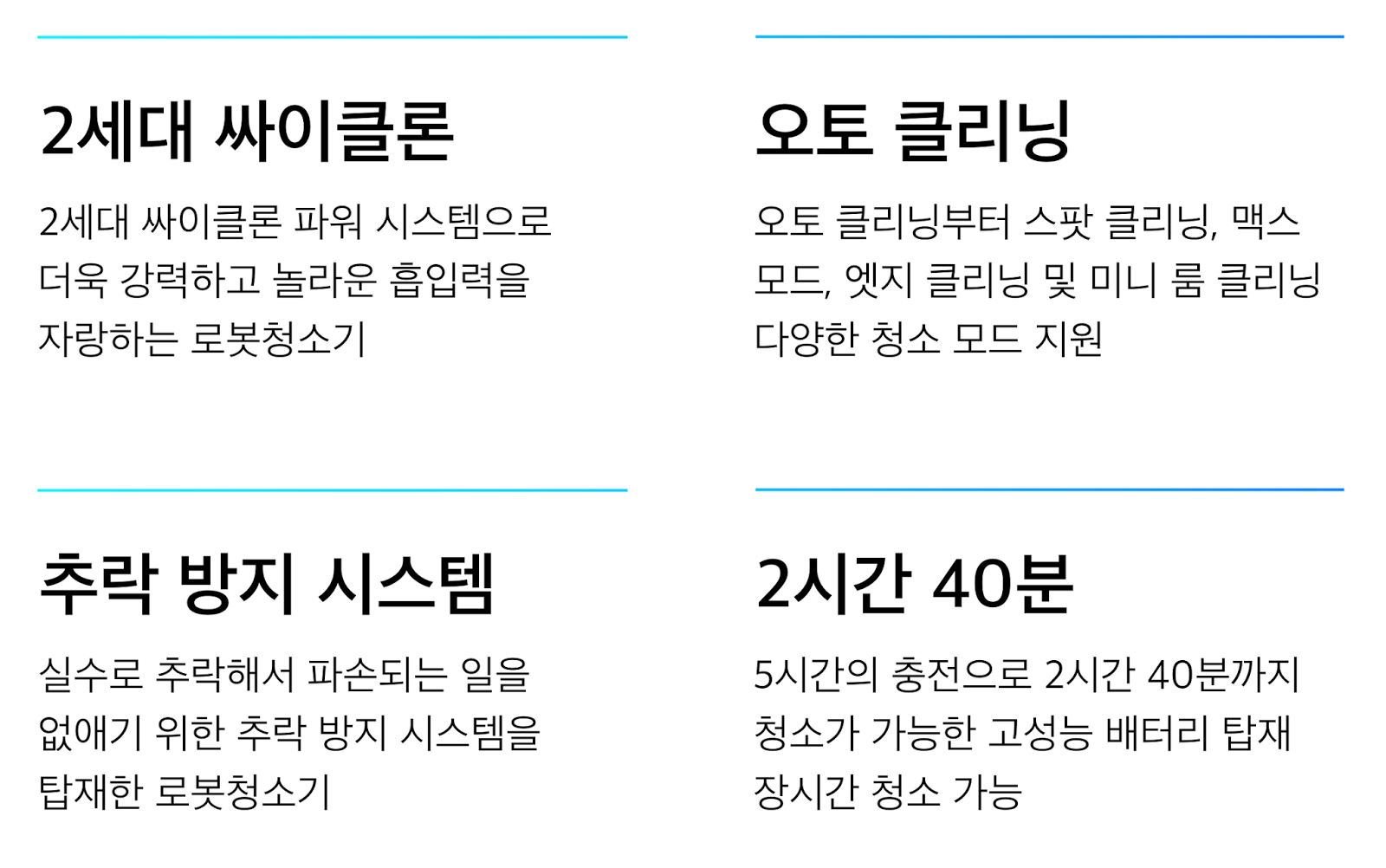 특히나 부드러운 360도 휠을 통해서 어디든 자유롭게 이동할 수 있었는데요. 청소 기능으로는 오토 클리닝을 비롯해 스팟 클리닝, 맥스 모드, 엣지 클리닝 및 미니 룸 클리닝과 같은 다양한 청소 모드를 지원해서 원하는 청소를 할 수도 있었습니다.