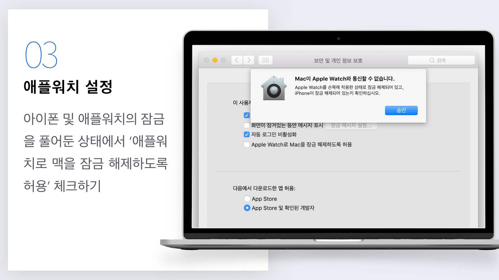 또한 아이맥 및 맥북 시리즈 2대 이상의 기기에서 함께 애플워치를 잠금 해제하기 위한 설정으로 활성화할 수 있을 뿐 아니라, 애플워치를 활용해서 잠금을 해제할 경우 애플워치에 알림 및 화면이 표시되기 때문에 다른 사람이 몰래 잠금을 해제할 수도 없게 됩니다.