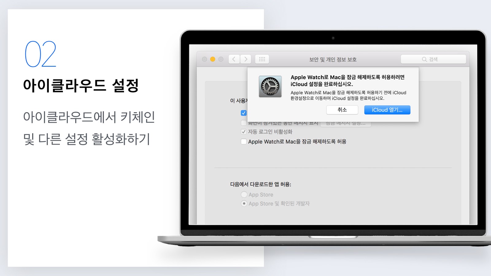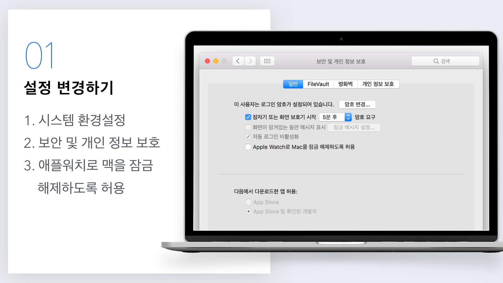 잠금 설정을 하지 않을 경우 누구나 쉽게 맥에 접근해서 정보를 훔쳐가거나 작업을 망쳐버릴 수 있기 때문에, 사무실일 경우 혹은 가정집일 경우 모두 잠금을 설정하는 것이 안전합니다.